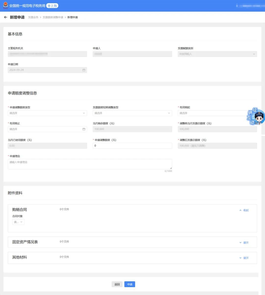 填写发票额度调整申请相关信息,上传相关附件资料;