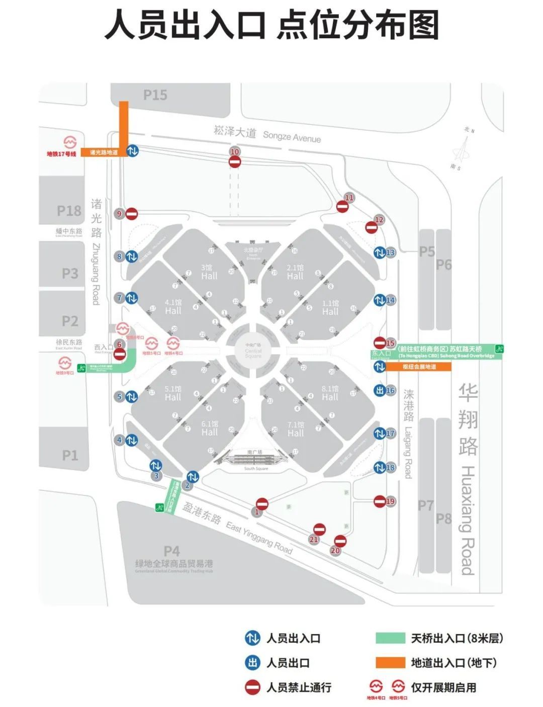 上午进场期间,地铁2号线出站客流较大,西登录厅进场排队时间长,建议乘坐地铁10号线抵达虹桥火车站,再换乘地铁17号线抵达国家会展中心站,穿过地道即可从北登录厅进场。