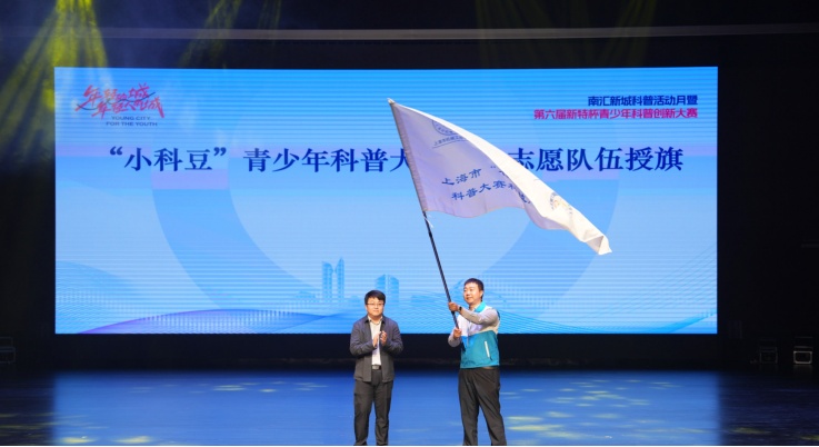 为了更好地推动大赛顺利进行,充分发挥科普在青少年成长中的积极作用,小科豆科技志愿总队成立“小科豆”青少年科普大赛科技志愿队伍,旨在凝聚一批热爱科技、富有热情且具备专业知识的大学生科技志愿者,为大赛提供全方位的支持和服务。开幕式上,临港新片区管委会党群工作部副部长、南汇新城镇党委委员谭荣友为上海市“小科豆”科技志愿团队队长、上海市机械工程学会办公室主任王镒杰授旗。