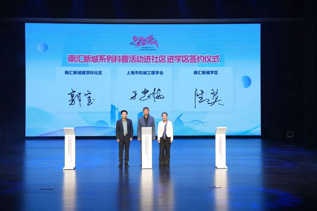 开幕式上,上海市机械工程学会常务副理事长兼秘书长于忠海,顶科社区党总支书记郭宝,南汇新城学区治理委员会主任、临港一中、建平临港中学校长陆英签约共同签署了“南汇新城系列科普活动进社区进学区”战略合作协议,将为南汇新城镇的科普事业注入新的活力,将优质的科普资源送进社区、送进校园。