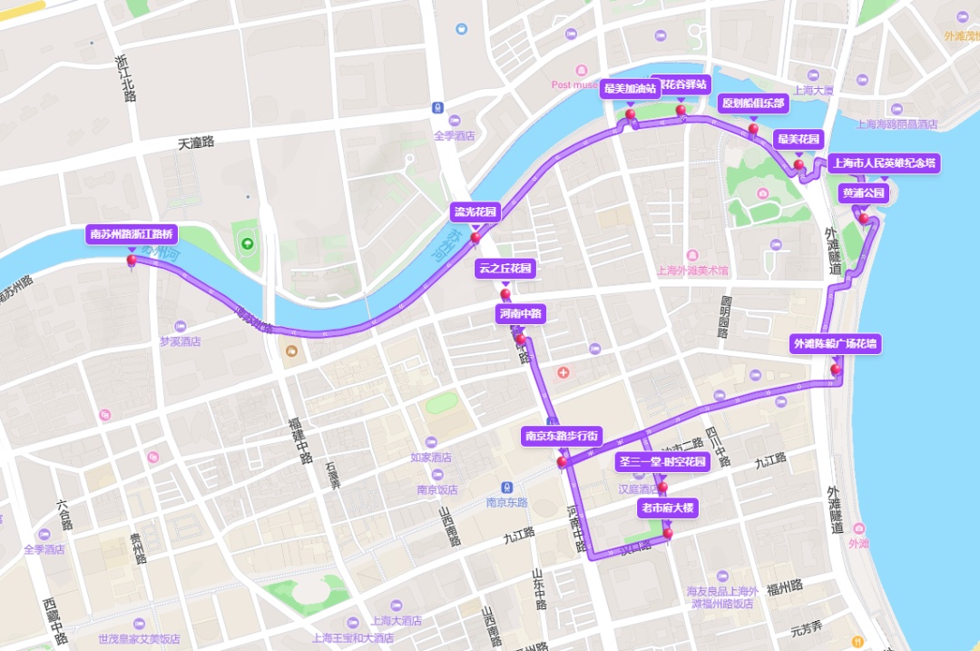 南京东路—外滩风景区—南苏州路美丽街区,自河南中路北京东路起,至南苏州路浙江路桥结束,全程3.1公里。