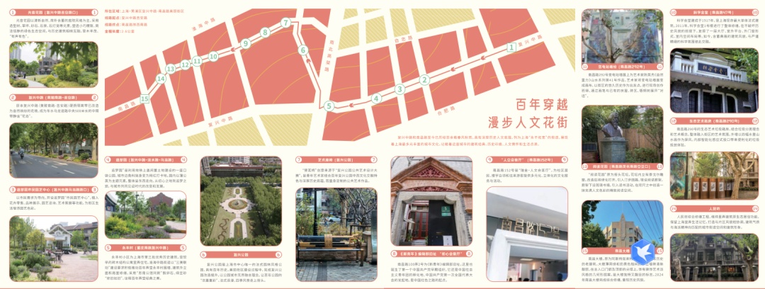 本条路线将复兴中路(吉安路—重庆南路)与南昌路(雁荡路—陕西南路)以及复兴公园进行串联,全程约2.6公里。以“百年公园”复兴公园为中心,路线以“光音花园”为起点,“阅读花园”终点,经过追梦园、复兴公园、科学会堂等16个主要景点,可以阅读街区的绿色生态、红色经典、历史人文、艺术共建、业态更新等方方面面。本条线路被选为“2024世界城市日”全市25条精品美丽街区线路之一。