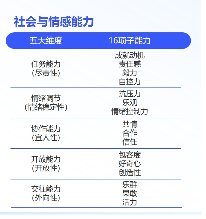 据黄忠敬介绍,社会与情感能力也可以理解为我们常说的“情商”,一般国际测评将其分为五大维度16种子能力。