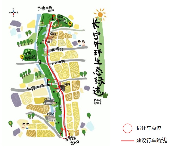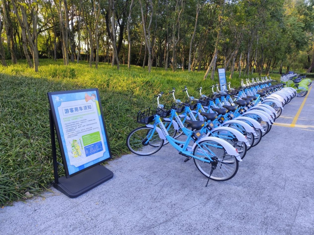 为了方便市民和游客使用,长宁外环绿道共设置了3个共享自行车站点,分别是临空音乐公园出入口、仙霞西路出入口和友乐路出入口。