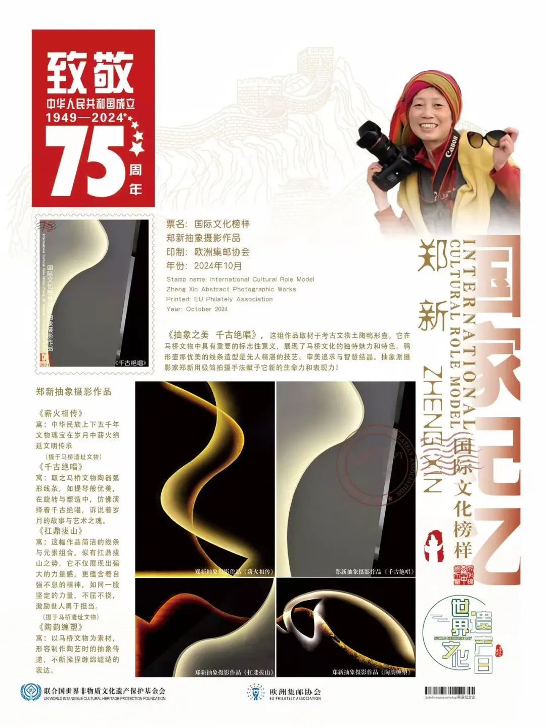 中国摄影艺术节是国内创办最早、关注度持久、影响力广泛的摄影节,自1989年以来,历经35年,已成功举办14届,被誉为全国摄影界的盛会。本届艺术节摄影展以“弘扬中国优秀文化、展示自然生态之美”为主题,推出丰富多彩的展览及活动,展示推广优秀摄影作品,培育扶持优秀摄影人才,在提升文化影响力的同时,为观众呈现了一场视觉盛宴。 此次入展“国字号”艺术节,摄影家郑新带来的这组抽象摄影作品取名《抽象之美 千古绝唱》,取材于考古文物土陶鸭形壶,其在马桥出土的文物中具有标志性意义,展现了马桥文化的独特魅力和特色。鸭形壶优美的线条造型是先人精湛的技艺、审美追求与智慧结晶。郑新用极简的拍摄手法,赋予其新的生命力和表现力。 《薪火相传》寓意中华民族上下五千年文物瑰宝在岁月中薪火绵延文明传承。 《陶韵缠塑》以马桥文物为素材,形容制作陶艺时的抽象传递,不断揉捏缠绵缱绻的表达。 《扛鼎拔山》这幅作品简洁的线条与元素组合,似有扛鼎拔山之势,更蕴含着自强不息的精神。 《千古绝唱》取自马桥文物陶器弧形线条,如提琴般优美,在旋转与塑造中,诉说着岁月的故事与艺术之魂。 值得一提的是,这四幅作品还于2024年10月被联合国非物质文化遗产基金会与欧洲邮票协会制成纪念邮票发行与典藏。方寸邮票,助力马桥文化在国际舞台上绽放璀璨光芒。 迁居马桥9年多来,郑新从马桥文化中汲取了丰厚滋养,从而完成了从具象摄影、画意摄影、意象摄影到纯抽象摄影艺术的蝶变,逐渐形成了抽象派的摄影风格。马桥这片热土,也为她提供了创作的灵感和丰富的素材。2018年,郑新在马桥组建了一支抽象摄影团队,通过镜头不断拓展马桥文化的表现形式和创作空间。 今年5月17日,“走进马桥·上海之本”抽象摄影主题展暨“抽象摄影学习研究会马桥基地”揭牌仪式在修葺一新的马桥文化展示馆举行。主题展汇聚了45位抽象派摄影家,通过别具一格的艺术视角和创意表达,历时6年创作的205件佳作。如今,延展择址上海韩湘水博园,在亭台楼阁间继续展现马桥文化的独特魅力。