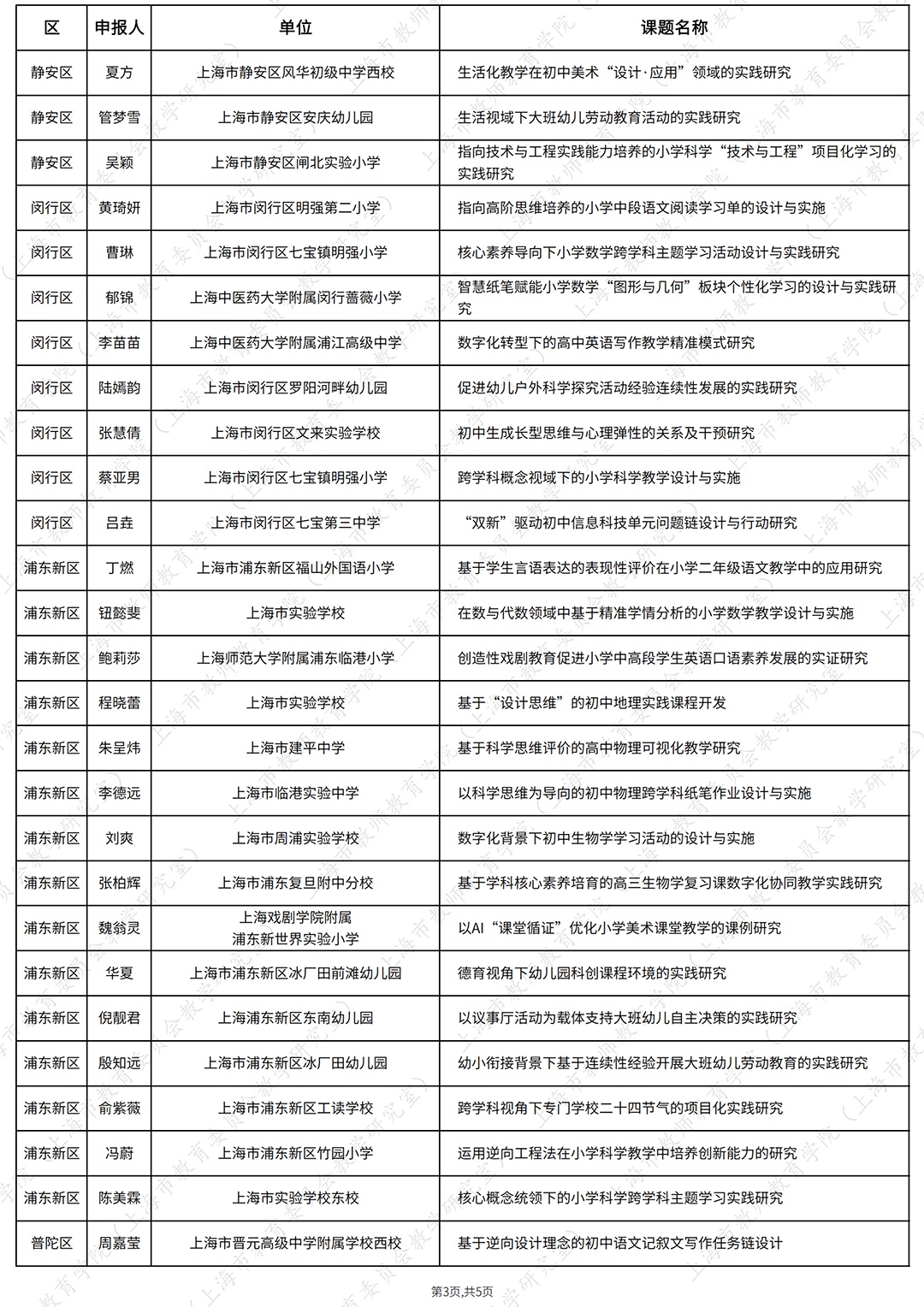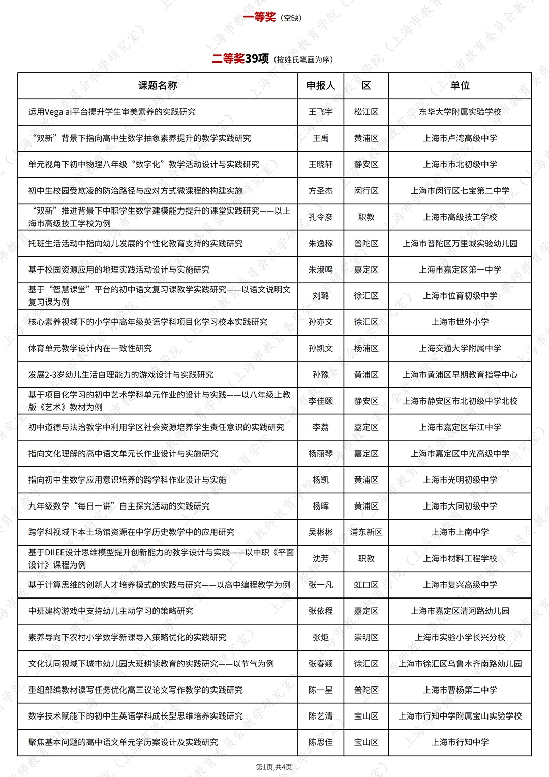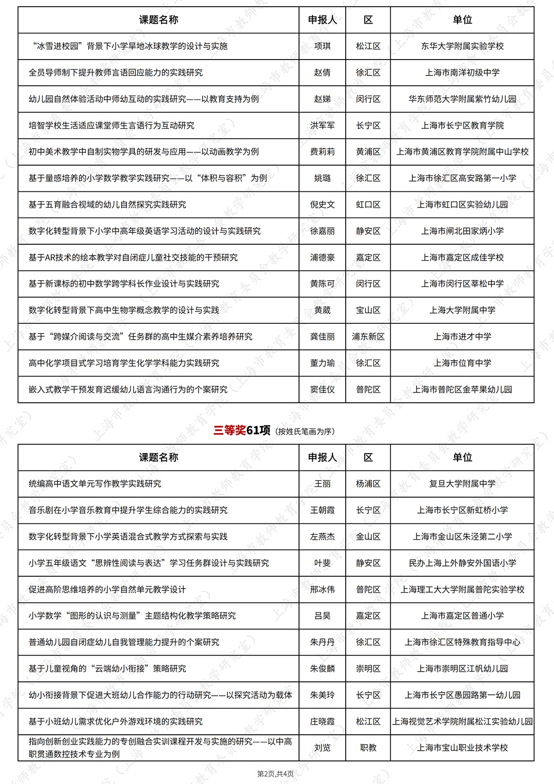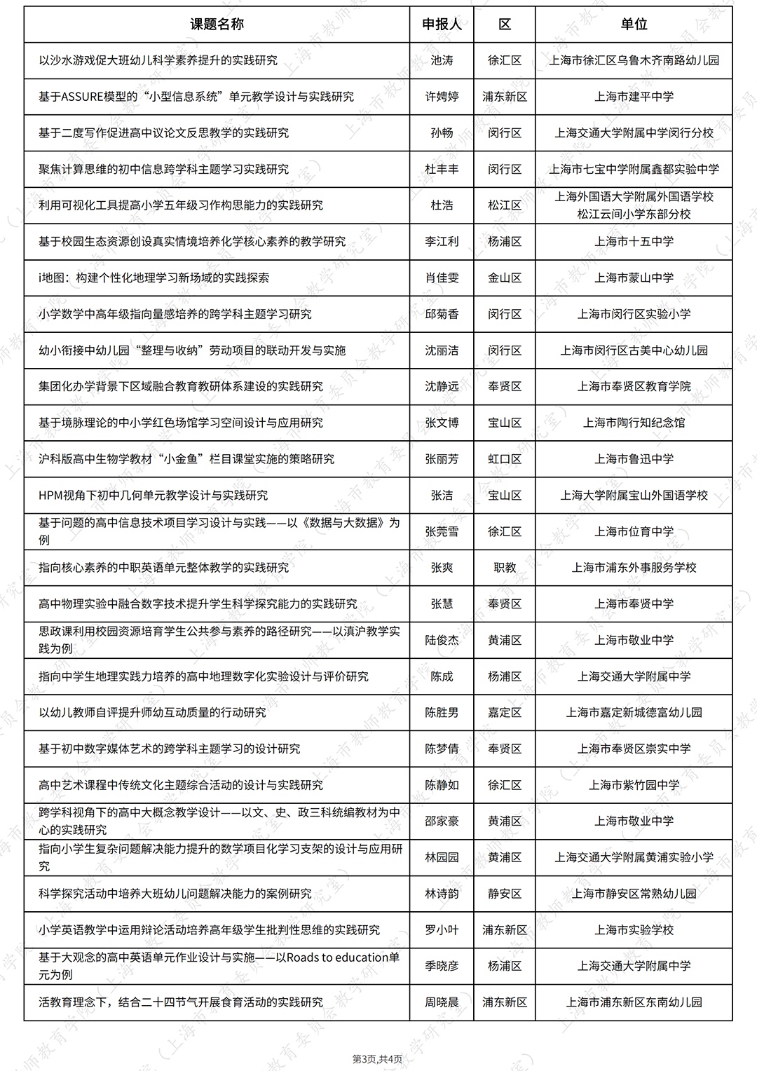 结题优秀推荐 “2024年上海市青年教师教育教学研究课题结题优秀推荐活动”经专家独立评审与集体讨论、学科评审组推荐与总评委集体投票,最终在申请结题的197项课题中,评出拟获二等奖课题39项、拟获三等奖课题61项(一等奖课题空缺)。 现将拟获奖名单公示如下。 (点击查看大图) 立项遴选 “2024年上海市青年教师教育教学研究课题立项遴选活动”,经专家独立评审与集体讨论、学科评审组推荐与总评委集体投票,最终在申请立项的219项课题中,评出准予立项课题134项。 现将拟立项课题名单公示如下。 (点击查看大图)