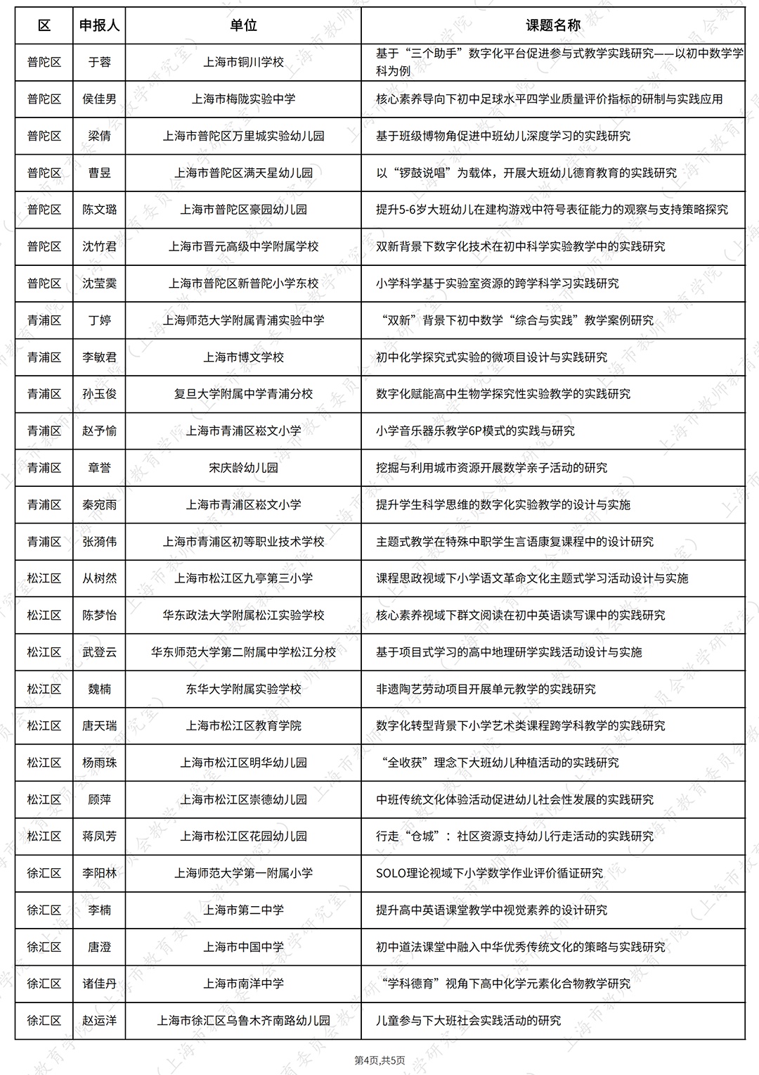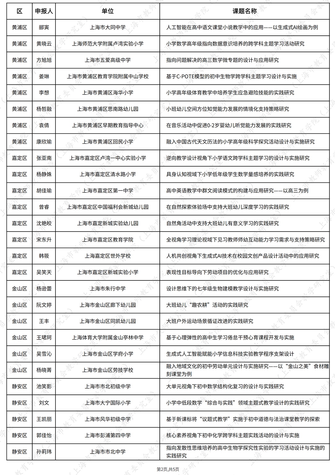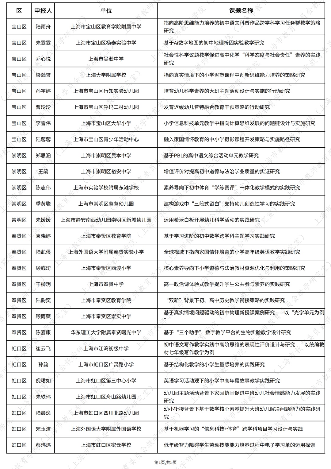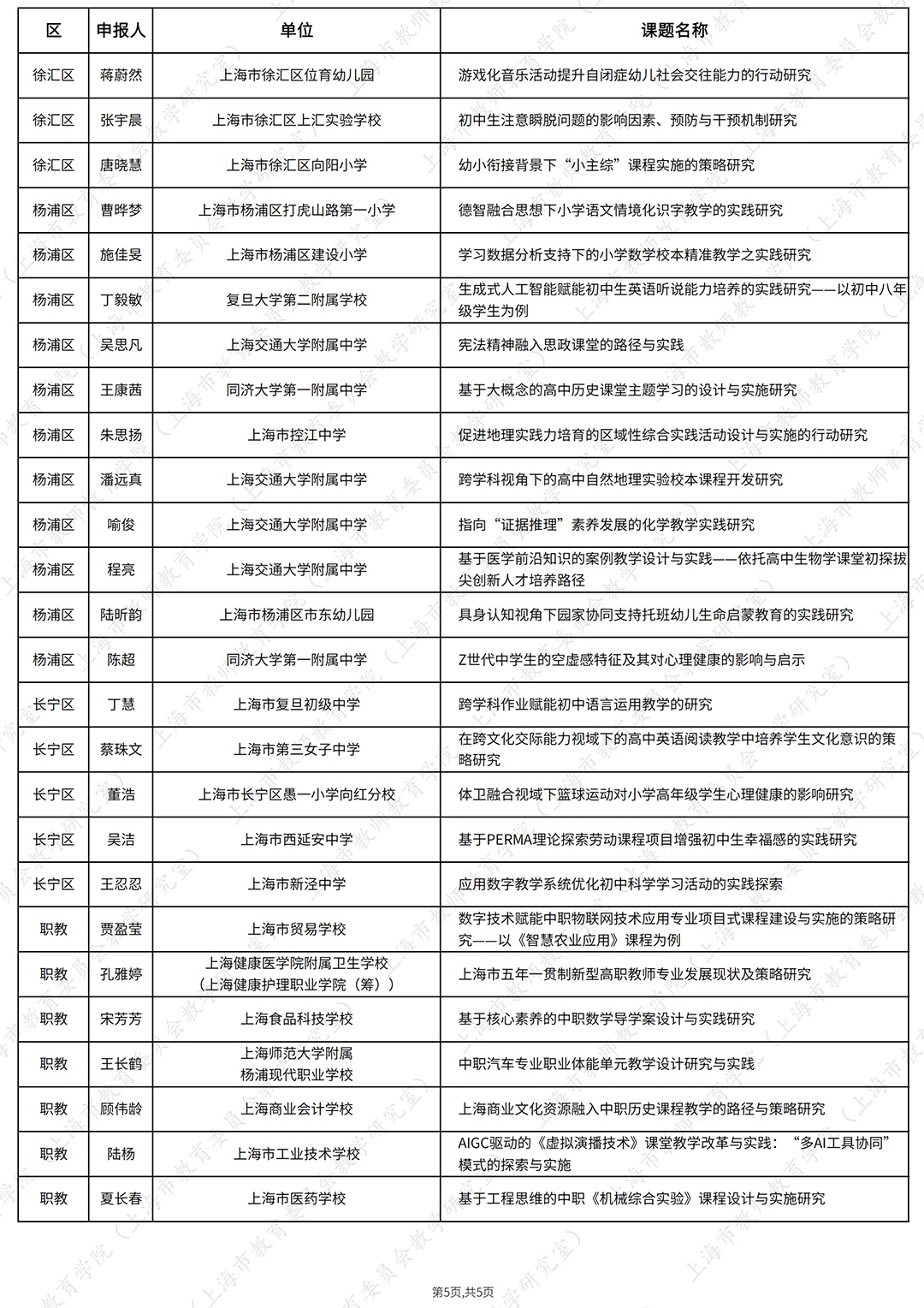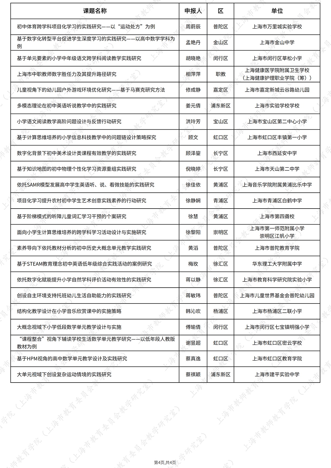 结题优秀推荐 “2024年上海市青年教师教育教学研究课题结题优秀推荐活动”经专家独立评审与集体讨论、学科评审组推荐与总评委集体投票,最终在申请结题的197项课题中,评出拟获二等奖课题39项、拟获三等奖课题61项(一等奖课题空缺)。 现将拟获奖名单公示如下。 (点击查看大图) 立项遴选 “2024年上海市青年教师教育教学研究课题立项遴选活动”,经专家独立评审与集体讨论、学科评审组推荐与总评委集体投票,最终在申请立项的219项课题中,评出准予立项课题134项。 现将拟立项课题名单公示如下。 (点击查看大图)