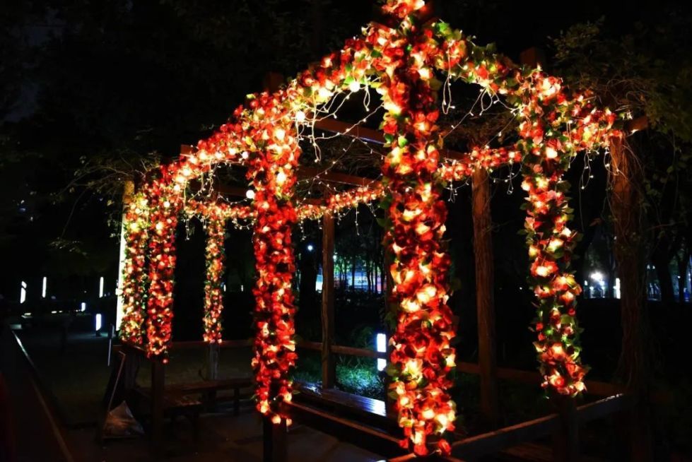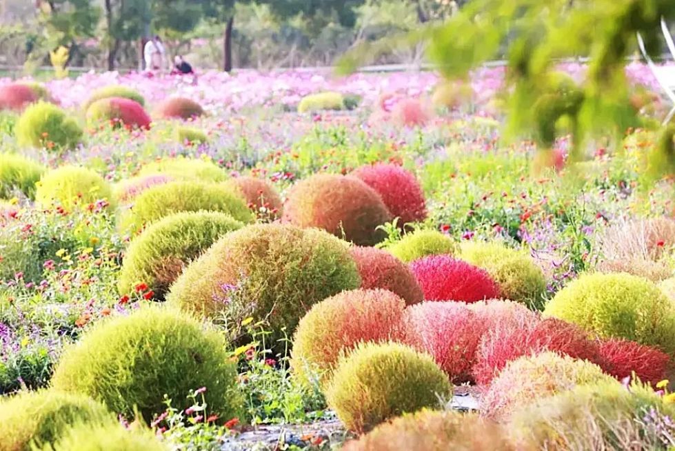 走进嘉北郊野公园,一片片色彩斑斓的地肤映入眼帘,从翠绿渐变至金黄,再点缀以火红的热烈,最终汇聚成一片金黄色的海洋。为了方便游客拍照打卡,园方还设置了小风车、红木桥、秋千等景观小品,供游客解锁更为多元的游览、拍照体验。
