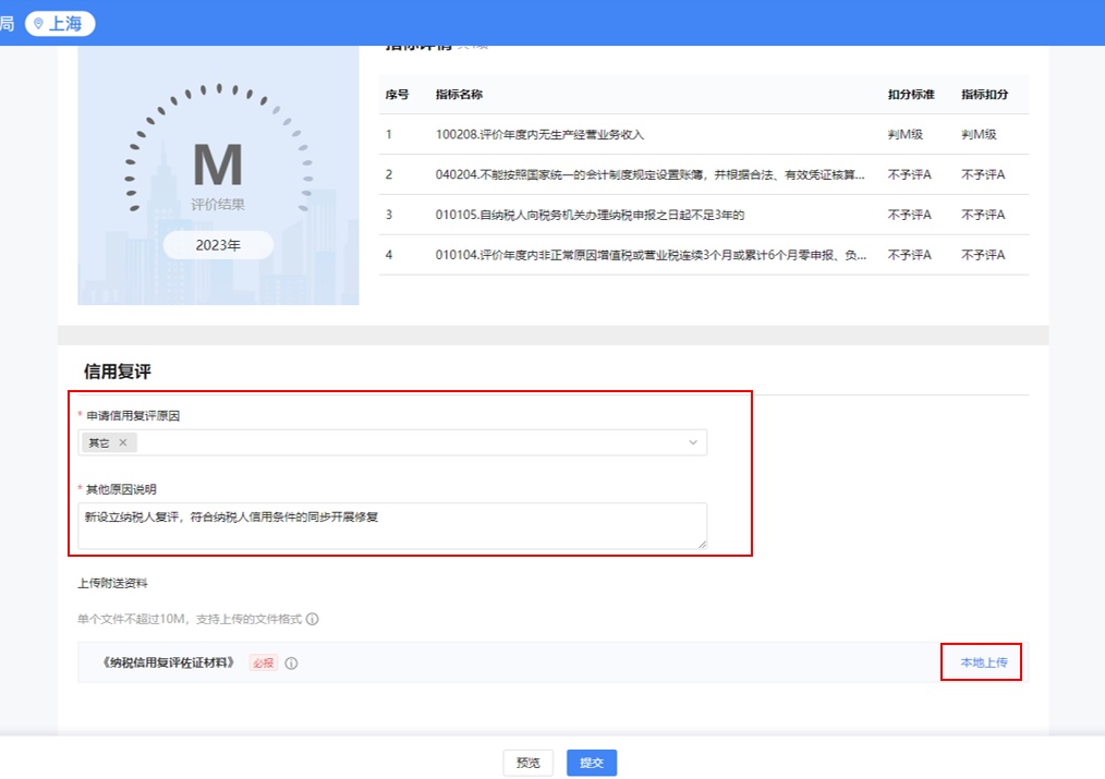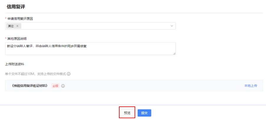 选择“申请信用复评原因”为“新设立纳税人复评,符合纳税人信用条件的同步开展修复”,填写必填内容并上传佐证材料。