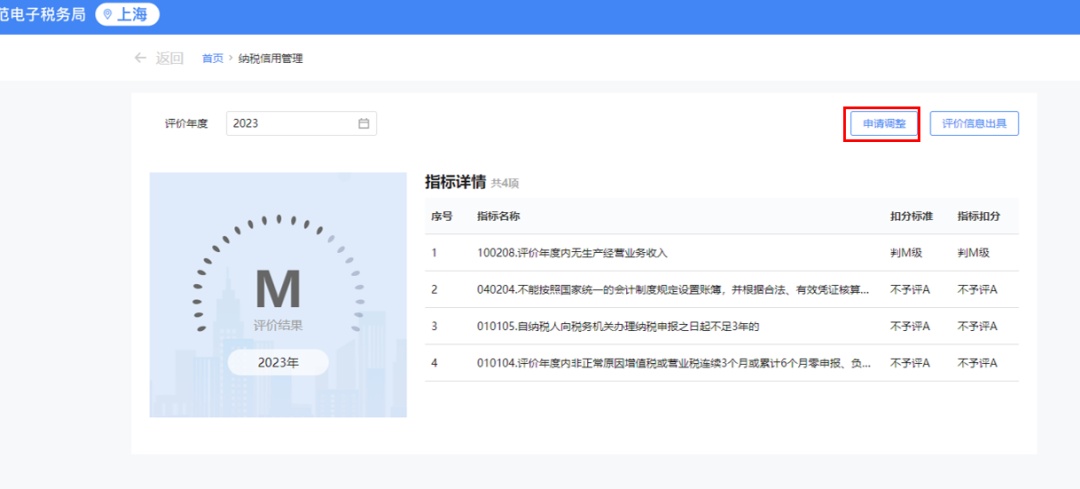 进入纳税信用管理界面,选择评价年度为“2023”,点击【申请调整】。