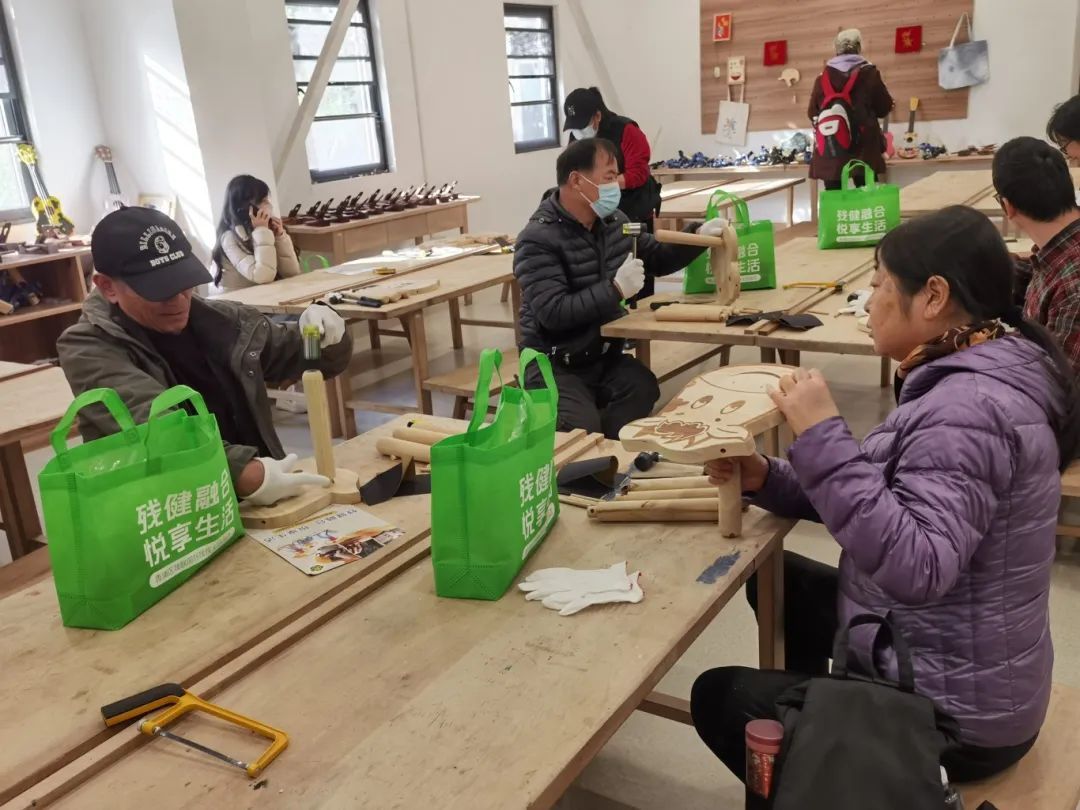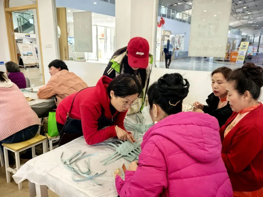 “这次我们给大家准备的是手工制作包包的材料包,下面我们来看一下制作过程……”本次主题活动设置了茭白叶编织、生肖凳制作、手串设计、陶艺创作等多个项目。大家在志愿者和手工老师的指导下,拿起分发的材料,进行制作。在大家的手中,“原材料”逐渐变成了一个个“成品”。