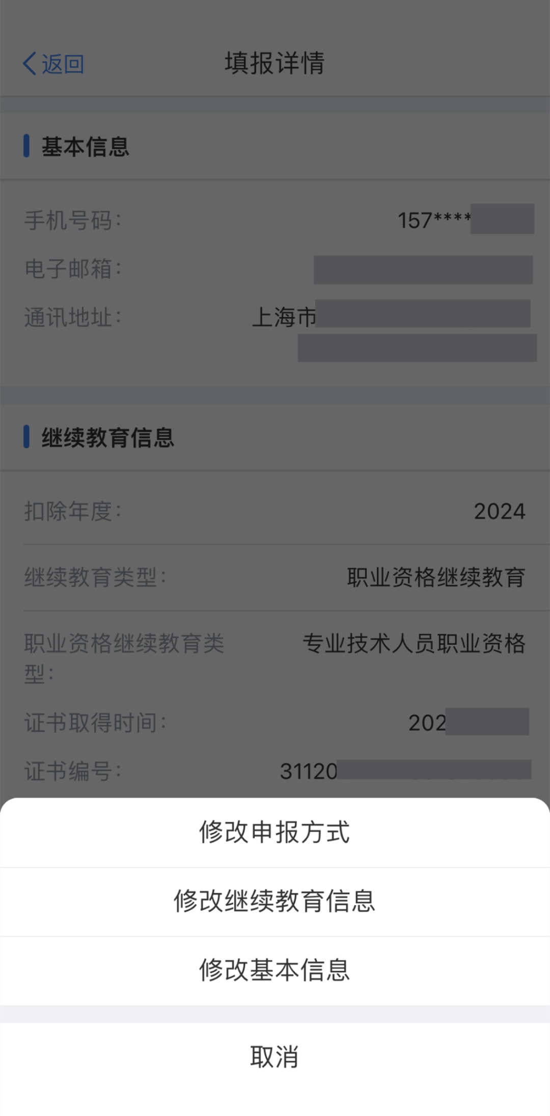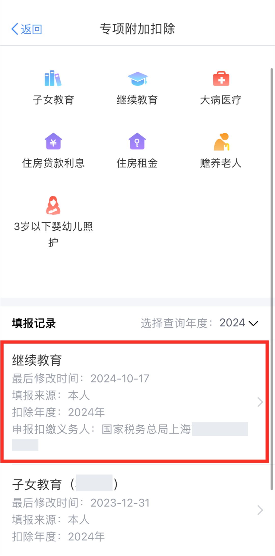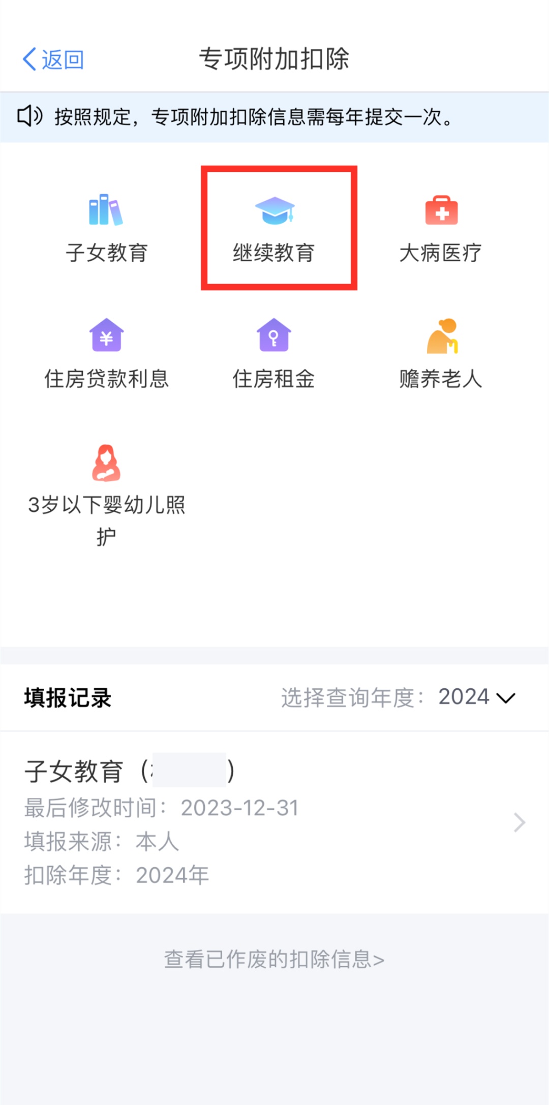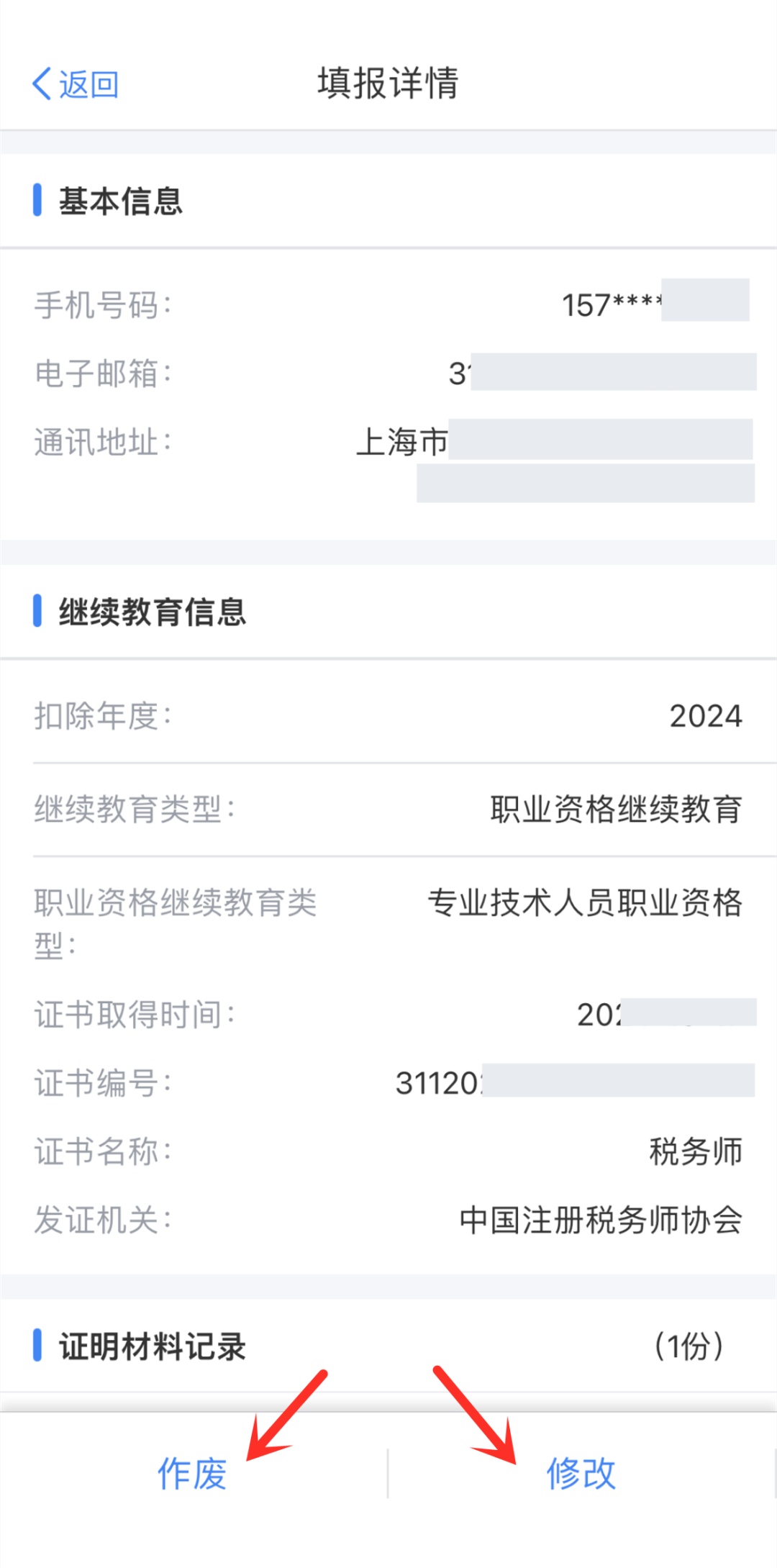 若您发现填报信息有误,可通过“专项附加扣除”专页——“填报记录”,选择对应年度,点击“继续教育”,进行“作废”或“修改”。