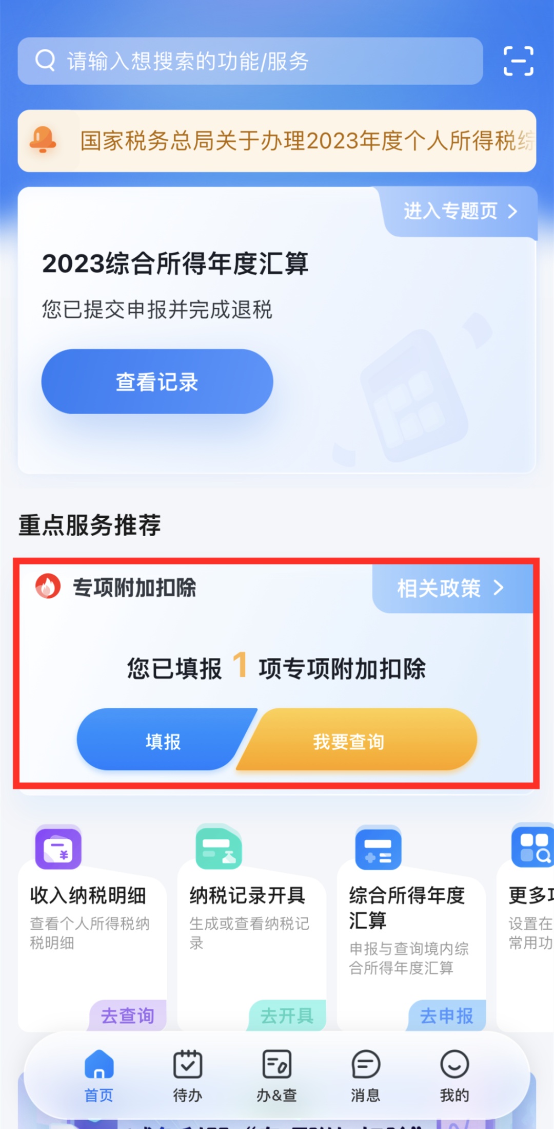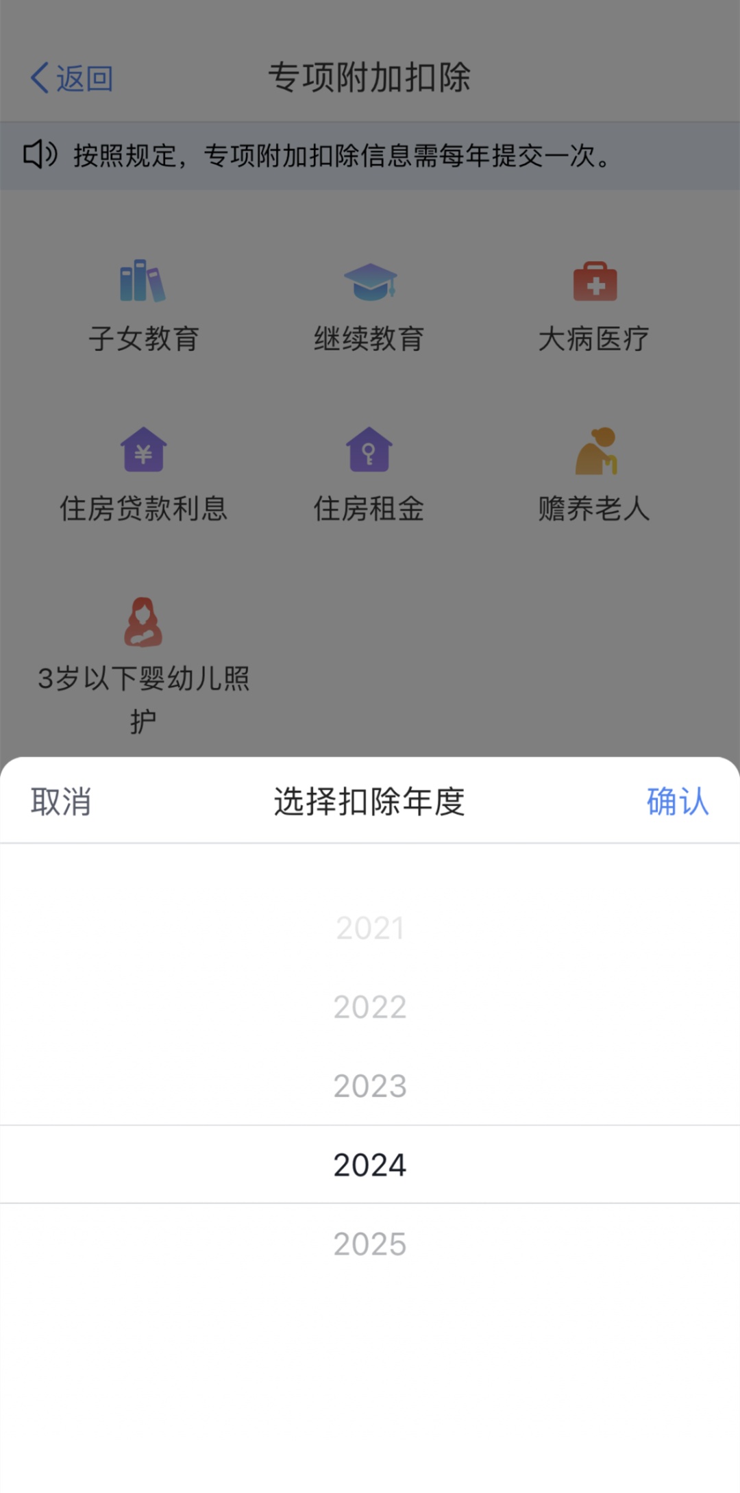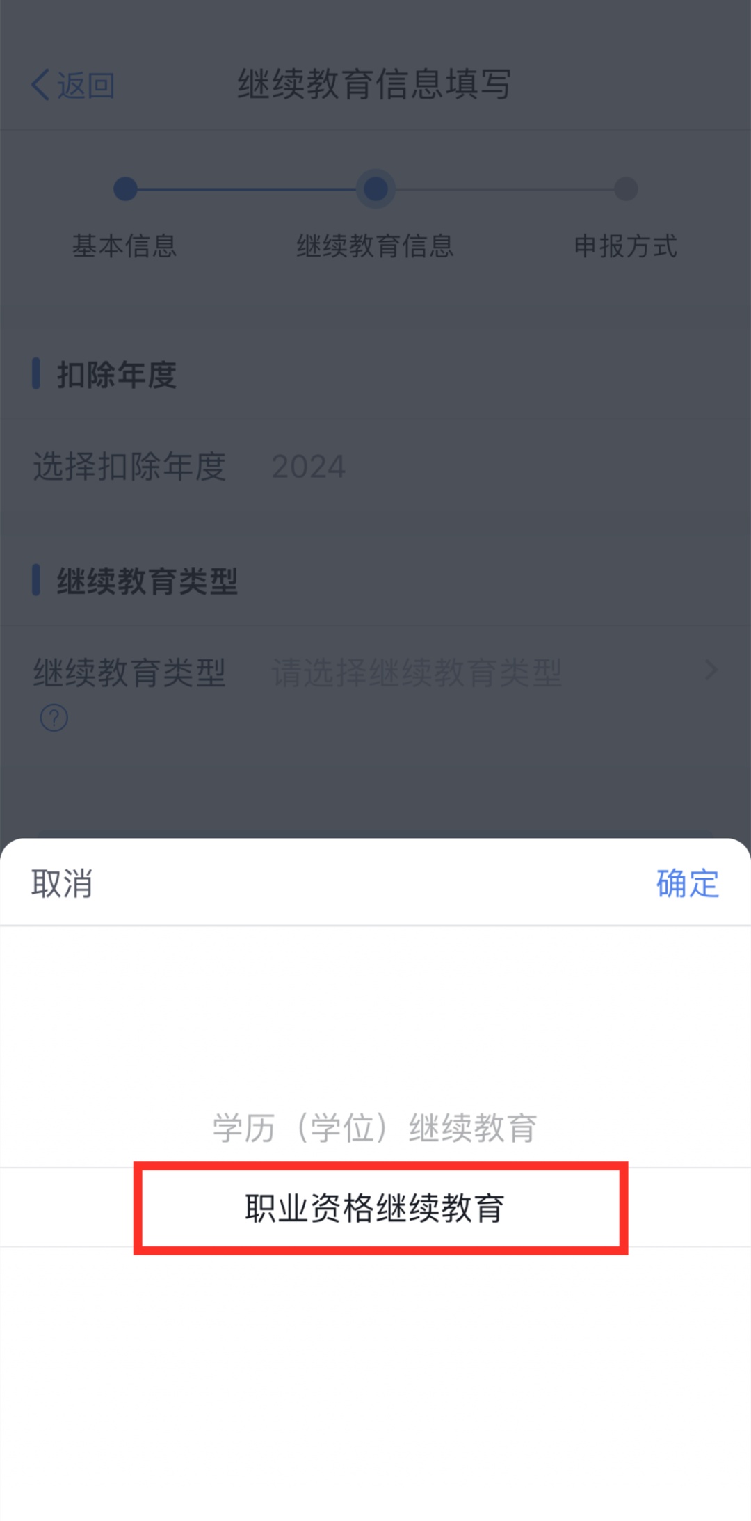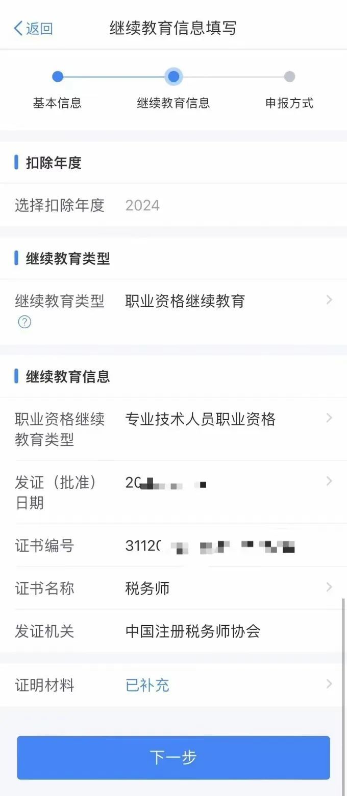 打开个人所得税App,点击首页重点服务推荐【专项附加扣除】栏,进入专项附加扣除专页,点击【继续教育】,“选择扣除年度”为取得证书当年。
