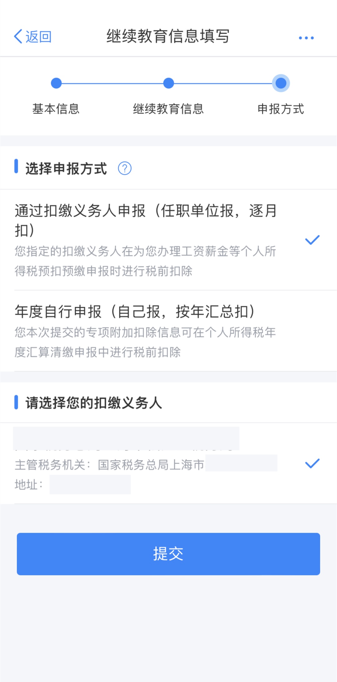 信息填写完毕后,可自行选择通过扣缴义务人申报或综合所得年度自行申报的申报方式,点击“提交”完成专项附加扣除项目填报。
