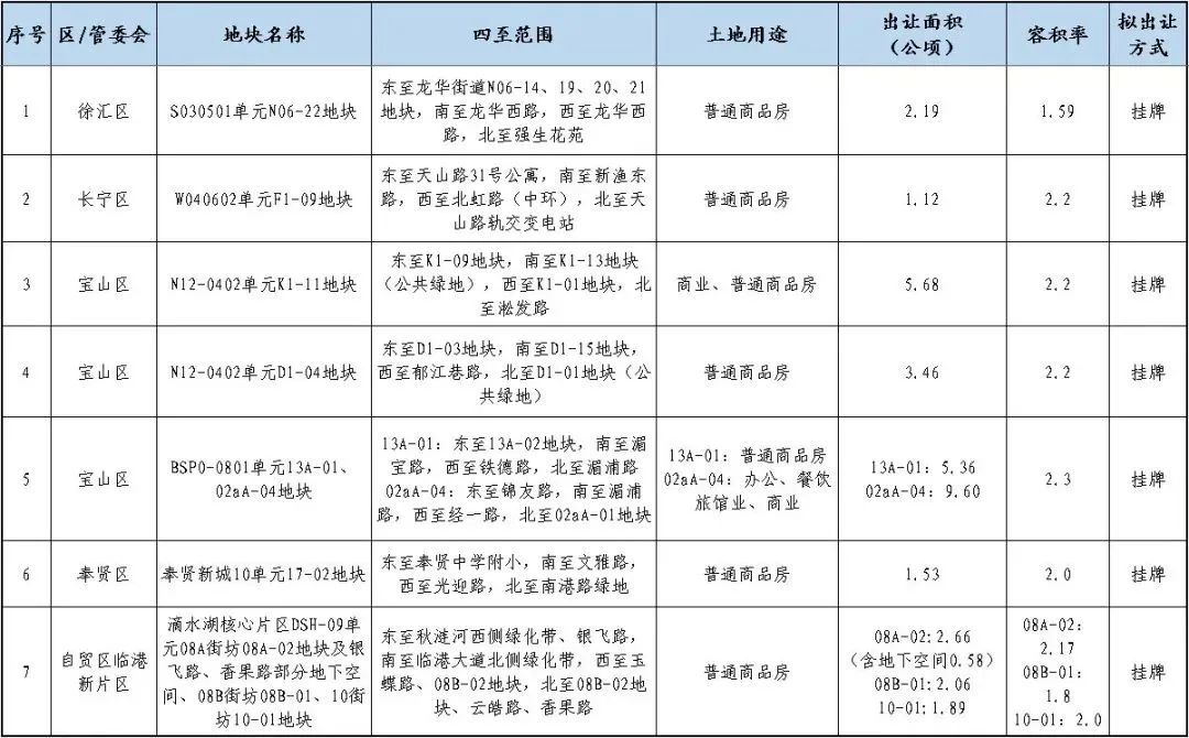 清单显示,八批次土拍共有7宗地块,分布在徐汇、长宁、宝山、奉贤以及临港,合计出让面积约35.54公顷,都将以挂牌方式出让。