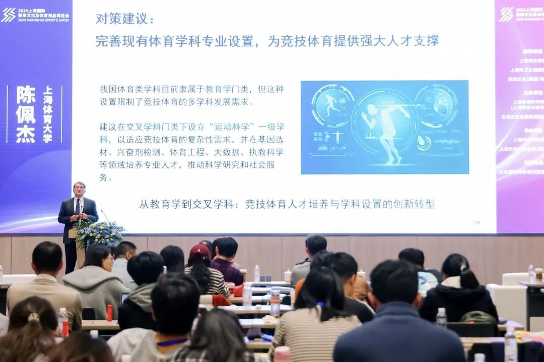陈佩杰做了题为《新质生产力推动下我国体育学科发展演进的思考:形态、价值和路径》的主旨演讲。从运动康复的角度出发,介绍了国内高校体育学与康复学的融合创新,为探索推动康复产业发展的又拓展了一条新的路径。