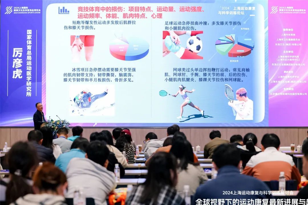 厉彦虎做了题为《运动康复与竞技体育》的主旨演讲,从运动康复与竞技体育的关系、国内外竞技运动与康复发展情况、运动康复与竞技体育前沿应用以及对竞技运动与康复的展望、体卫融合下的科学训练等多个方面,对运动康复和竞技体育做了深入的剖析,也为未来运动康复的前沿应用和发展方向给出了独到的见解。
