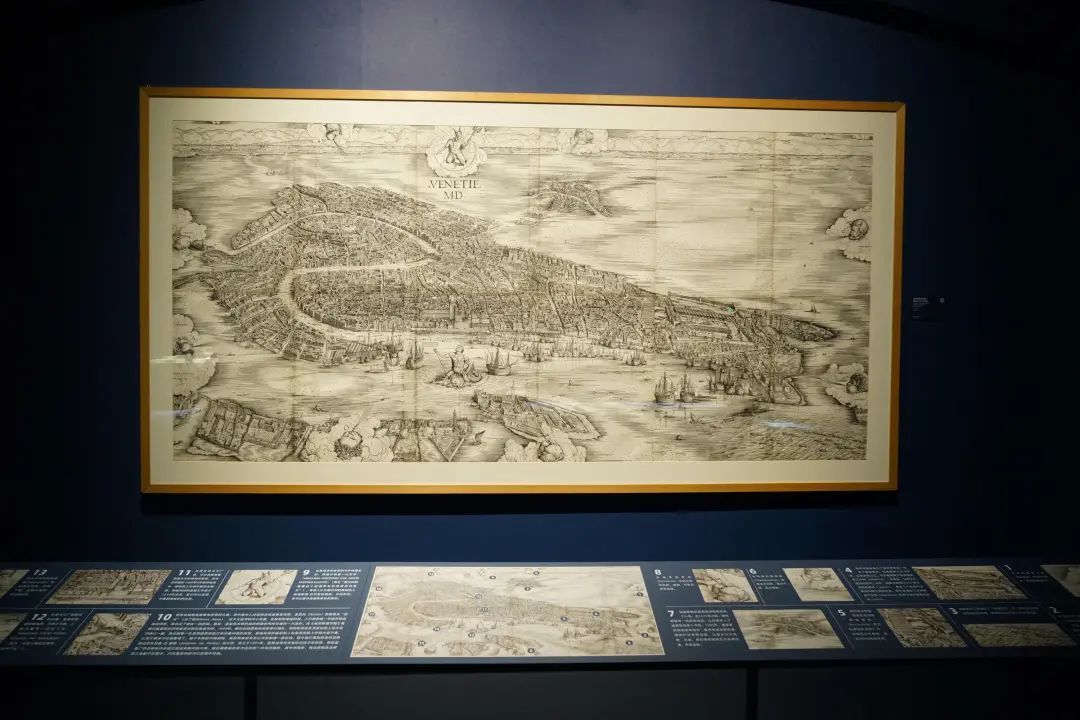 王樾以展品《威尼斯城市图》为例,“一般我们理解的地图,就是一个地方方向的指引而已,但实际上这幅版画的信息量非常大,它是至今最早所留存的大型城市鸟瞰图之一。”威尼斯人雅各布·德·巴巴里与他的助手们通过攀爬城市中的钟楼,借由几何与透视法则,经由想象力的拼凑将威尼斯的每座建筑、广场与河道等城市景观都记录下来。画面中港口与运河中成群的船只凸显了这座城市的勤劳、商业和海上力量。画面上方描绘了商业之神墨丘利的统治,海神尼普顿则骑着海豚穿过港口,现实场景与神灵融为一体,不仅象征着威尼斯这座国际贸易中心的海上商贸活动,也体现着意大利文艺复兴的创造。