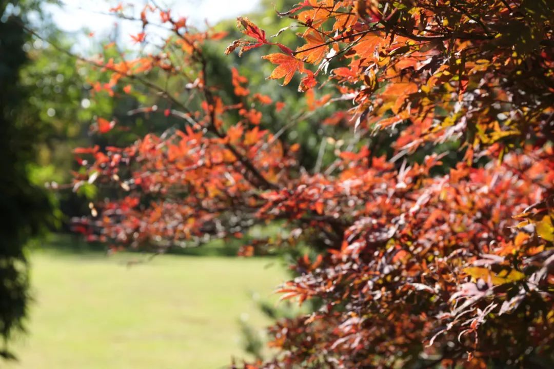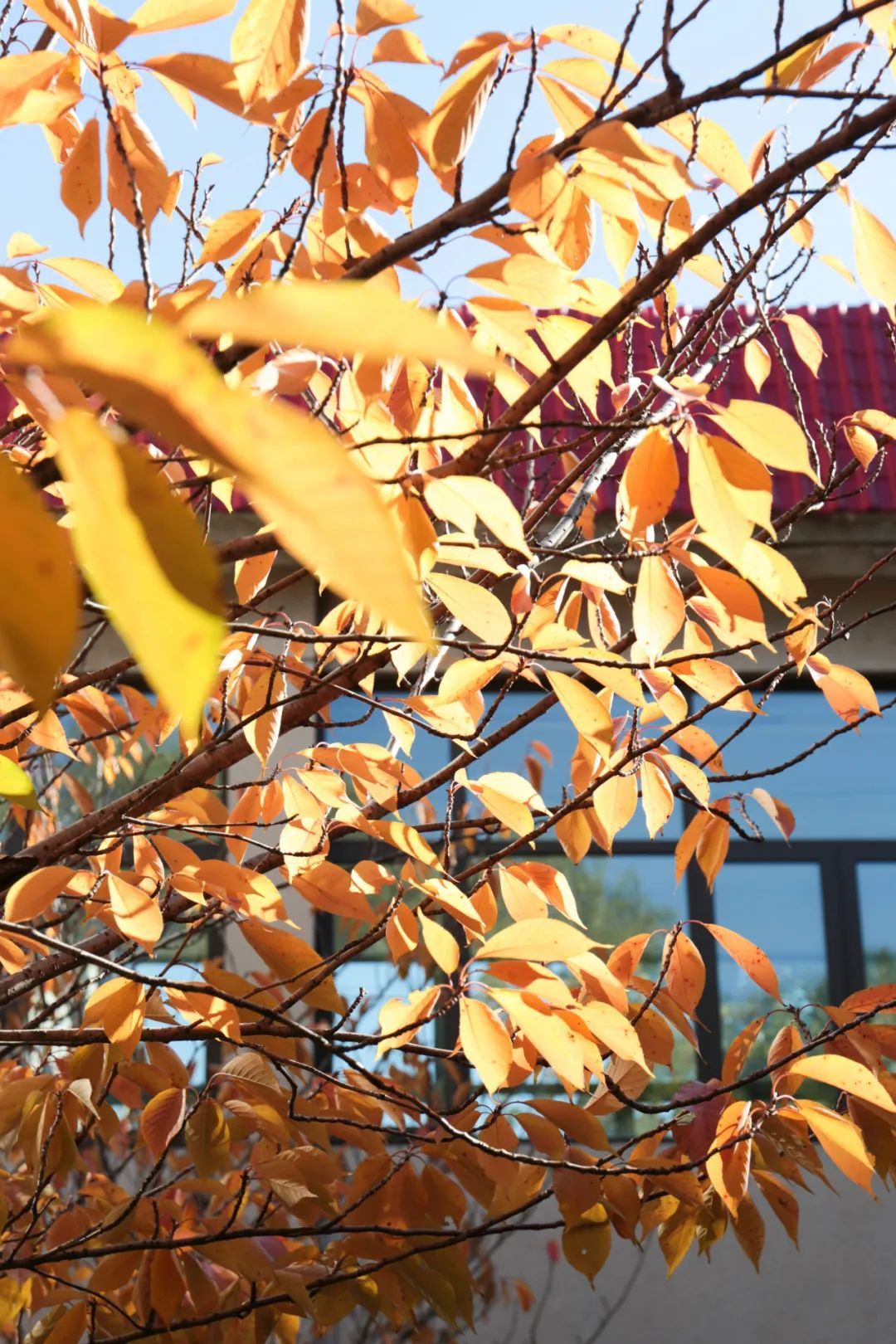 在槐花黄绿的映衬下,更显其凋叶棕的沉稳与殷红的热烈。海棠红如霞光般洒落,与枫叶斑斓交织,相映成趣。