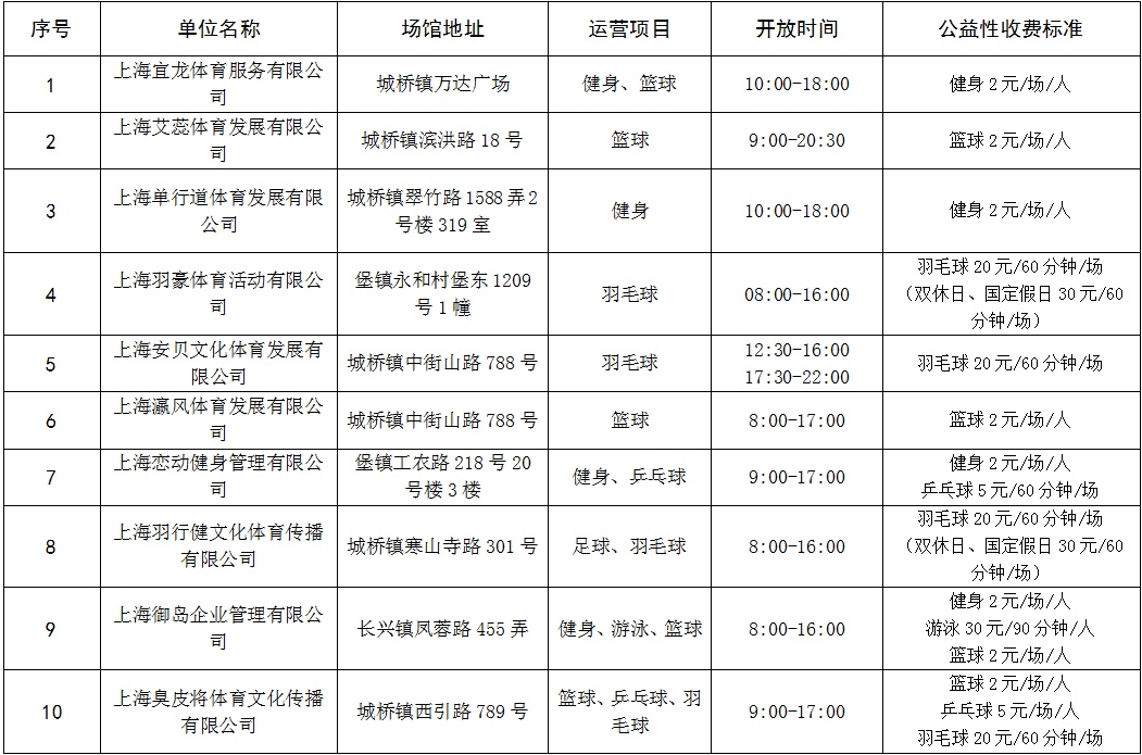 2021年,本市发布《上海市全民健身实施计划(2021—2025)》,要求支持经营性体育场所公益性开放。近年来,崇明体育部门积极组织开展本区经营性体育场所公益性开放认定工作,截至目前,全区已经有10家社会体育场馆(详细名单见文末)进行公益性开放。
