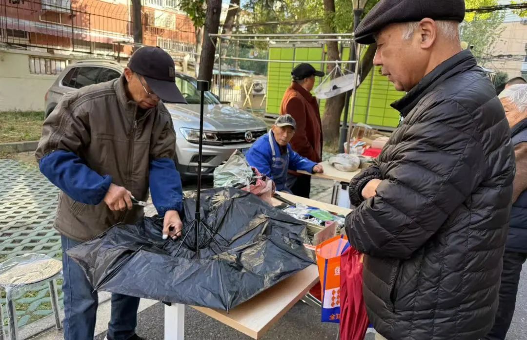▲北郊居民区新时代文明实践站社区志愿者为居民们提供修伞便民服务