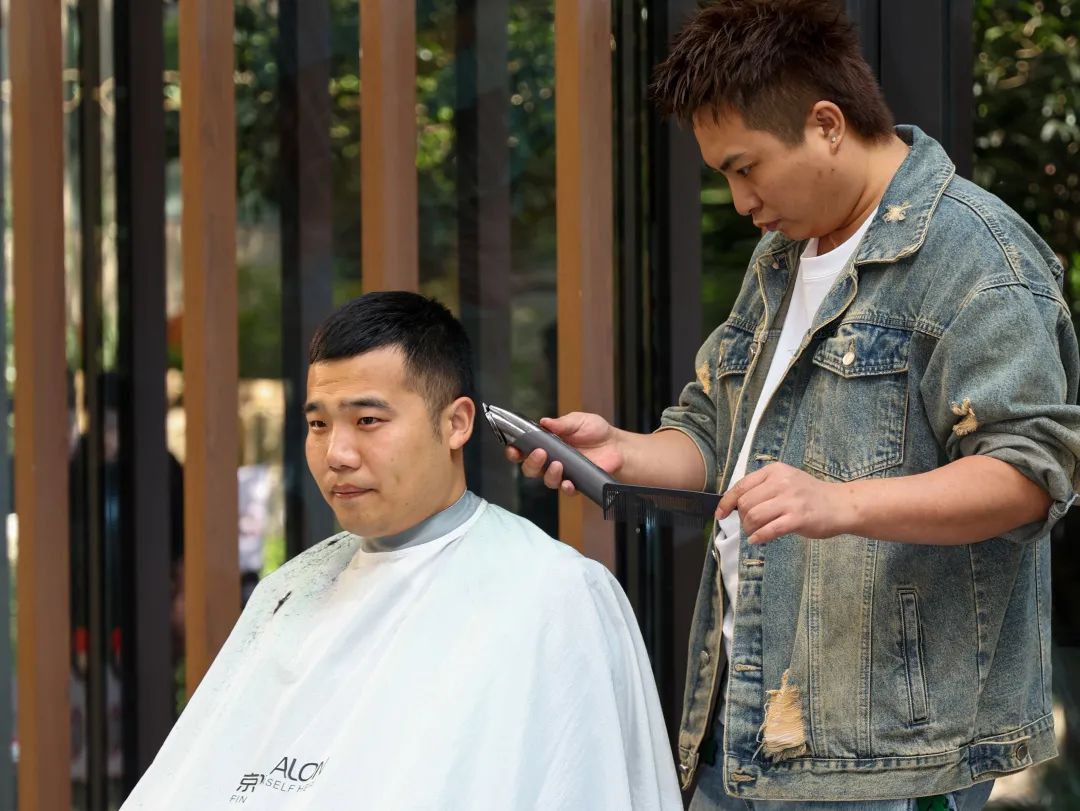 ▲安丘居民区新时代文明实践站便民服务现场,专业理发师志愿者为居民理发