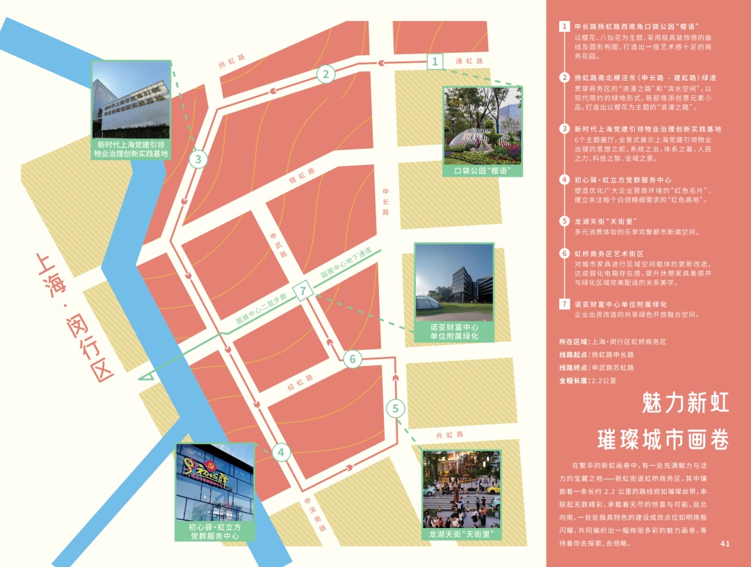 作为闵行区唯一入选的路线,通过步行的方式,市民朋友们可以在大虹桥近距离感受每一处细节背后的故事,共同见证人民城市建设的发展成果、共同参与谱写虹桥国际中央商务区高水平开放发展的新篇章。近8000平方米的占地空间,是商务区白领和新虹老百姓们享受静谧慢生活的“世外桃源”,是一处艺术生态的露天交流空间、一座休闲放松的微公园。一条以樱花为主题的“浪漫之路”。行人游走其间,可沿途赏绿树繁花,听林间鸟语。绿道沿途错落分布着设计感十足的造型坐凳、灯具等城市家具,休憩停留的同时还可品味艺术。地址:闵行区新虹街道申滨路233号(周一至周五8:30—17:00)全市12个基层党建创新实践基地之一,集展览展示、实践实训、理论研讨等功能为一体,设有6个主题展厅,全景式展示上海党建引领物业治理的思想之舵、系统之治、体系之基、人民之力、科技之智、全域之景,每个展厅都有不同的“风景”。地址:闵行区新虹街道申滨南路899号(全年开放9:00—22:00)室内总面积960平方米,共有三层,设有初心咖啡吧、专业书店读书角、企业会客厅、团建活动厅、数字直播间、屋顶花园等功能区。营造城市公共空间的野生感、舒缓感、艺术感,打造兼具温度与美学的松弛氛围。引入音乐会、脱口秀、观影等活动,除了午休时间外,下午的提神时间、下班后的放松时间都有丰富活动,全天候拥抱都市氛围。一条融合国际风范、长三角元素的艺术街区。用世界各国语言书写的“你好”街头小品,传递新虹街道喜迎各国商客的热情。利用山水的连绵起伏形成的天然屏障,巧妙地对大型电箱组群进行遮挡与美化。地址:闵行区新虹街道申滨南路1226号(绿地全年开放;以诺书房营业时间:工作日8:30—19:00,节假日视情况营业)爱阅读,爱拍照,爱咖啡的你,不能错过这片绿意盎然的绿地,作为新虹街道和区域企业诺亚财富共同建设的“友谊花园”,如今已成为周边白领休闲交流的绝佳场所。