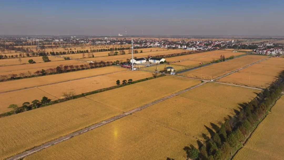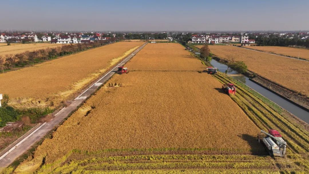 在稻米之乡新村乡,连片金黄的稻田翻滚出秋季独有的风景。在上海聚霞粮食种植专业合作社连片的稻田中,农机手驾驶着6台收割机来回穿梭,收割、脱粒、吐秆一气呵成。机器所过之处,稻浪翻腾,稻香扑鼻,一茬茬稻穗被收割,留下整齐的稻茬。