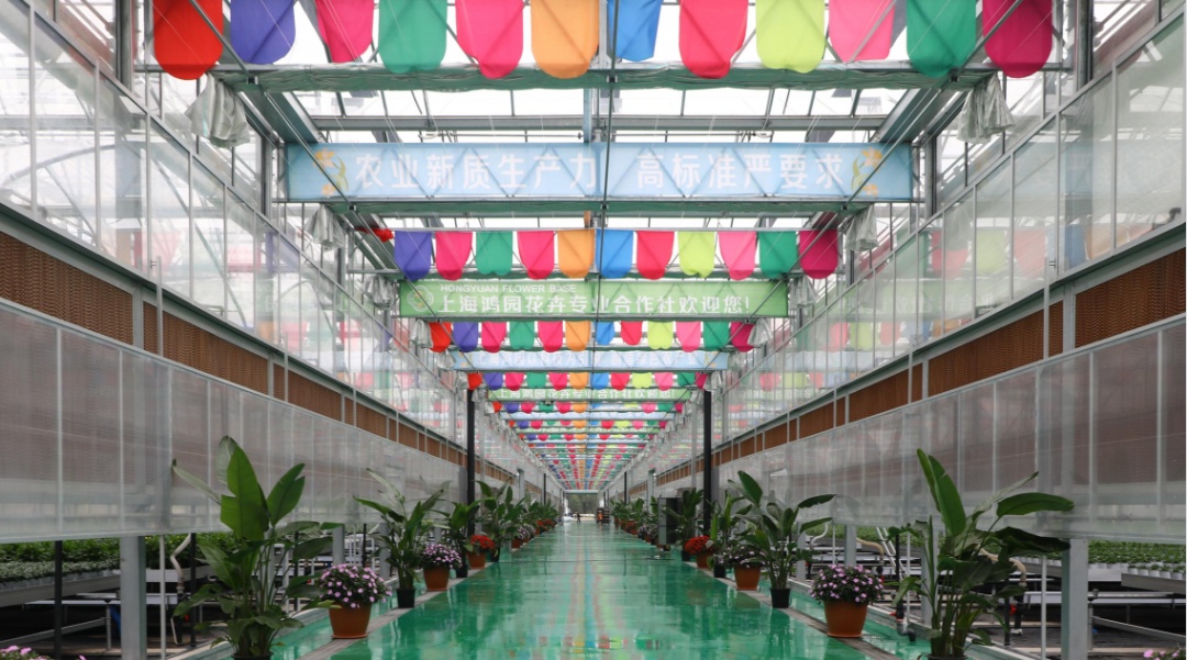 于今年10月建设完成的鸿园花卉基地已进入全面投产。基地有基质加工流水线、新型全开顶玻璃温室,采用先进的雨水回收循环利用系统、智能肥水灌溉系统,配备新型物流潮汐苗床,运用潮汐式灌溉和滴灌灌溉模式,推行绿色低碳发展模式,实现节水、节肥,降低病虫害发生,提升花卉种植品质。建有智能物联网系统,包含物联网管控中心、温室控制系统、气象站等,可随时监测生产。通过科技赋能,提升花卉品质、花卉产量的同时,减少农药使用量,形成绿色环保生产模式。