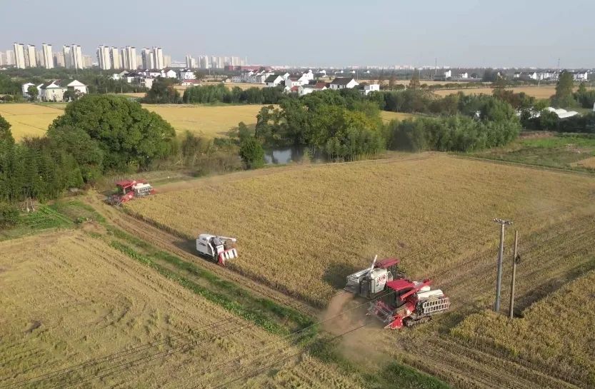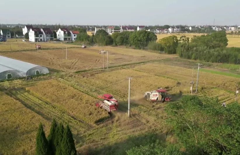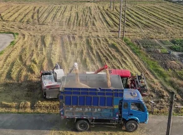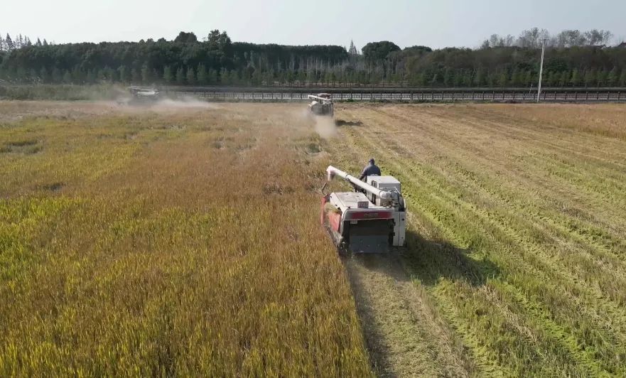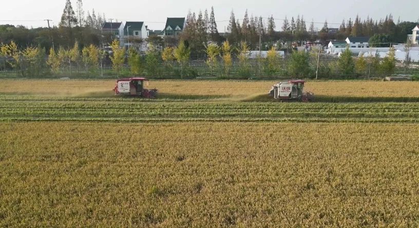 近日,廊下镇的万亩粮田犹如一片金色海洋。随着收割机的轰鸣声,一排排水稻被卷入脱粒仓,割穗、脱粒、渣粒分离,然后倒入运输车,运送至烘干房烘干加工,确保颗粒归仓。 上海沪耕农机服务专业合作社工作人员于胖子说:“这几天天气晴好,我们早上六七点起来就开始抢收。如果不抢收,下雨了水稻就会发芽。” 据了解,今年该合作社水稻种植面积达5200亩,主要以申优21、申优28、秀水519、花优134等品种为主。但今年秋季台风带来的多次暴雨天气给晚稻前期生长带来了不利影响,今年水稻出现大面积倒伏,亩产量预计在1000斤左右,比去年略微减产。 “我们水稻已经收了700多亩,预计一周后结束。小麦已经种了2000多亩,预计半个月内播种也将结束。”上海沪耕农机服务专业合作社负责人梅庆涛说。 据了解,今年金山区水稻种植面积约19.8万亩,截至目前,已经收割完成17.9万亩左右,收割进度超90%。正值晴好天气,区农业农村委也提醒农户抢抓雨水间歇期,尽早完成秋粮收割和储备工作。