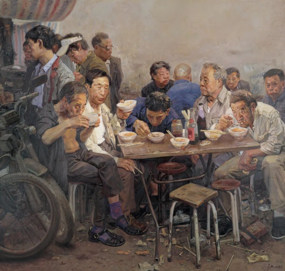 作为中国当代新现实主义油画的代表性人物,忻东旺以“直面现实、直面生命”的艺术作品,为当代绘画注入了深刻的社会关怀与人文精神。他的创作深植于社会现实,通过关注普通劳动者、农民工等群体,诸如《早点》、《明天·多云转晴》与《渡》,体现了艺术家对社会变革的关注,也折射出其对社会现象的敏锐洞察与反思。