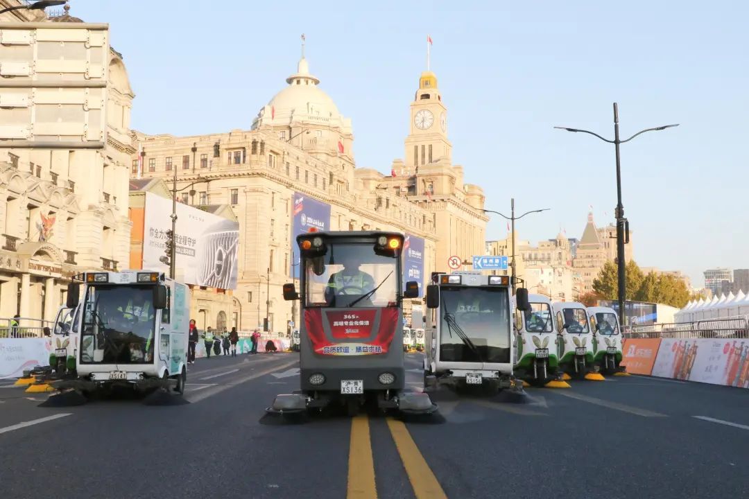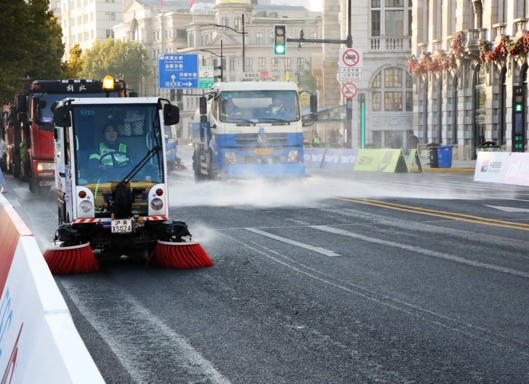 在这些保障队伍中,也少不了这群人。清晨7时多,当运动员们全部起跑完毕后,有一群人在候场了3个多小时后迅速到位。只见,在起跑点位置,多辆新能源清扫车辆呈大雁飞行的“人”字形依次开过来,车辆驶过之处,道路又迅速恢复了干净、整洁。