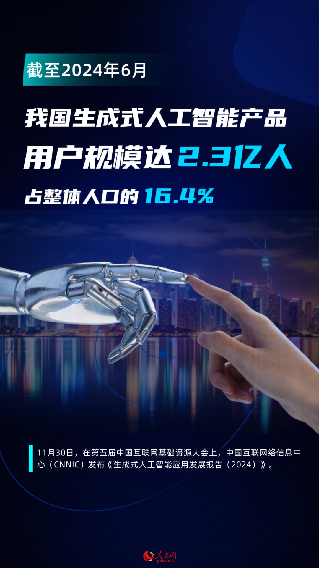 11月30日,中国互联网络信息中心(CNNIC)在第五届中国互联网基础资源大会上发布《生成式人工智能应用发展报告(2024)》(以下简称《报告》)。《报告》显示,截至2024年6月,我国生成式人工智能产品的用户规模达2.3亿人,占整体人口的16.4%。