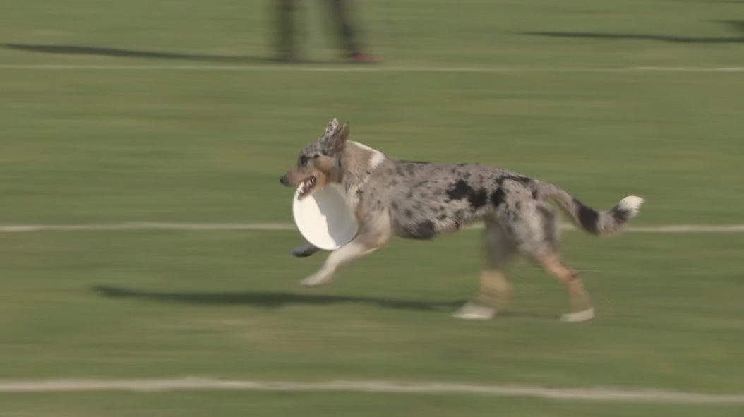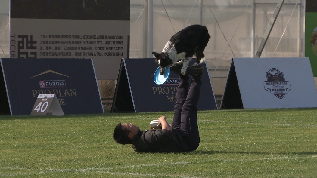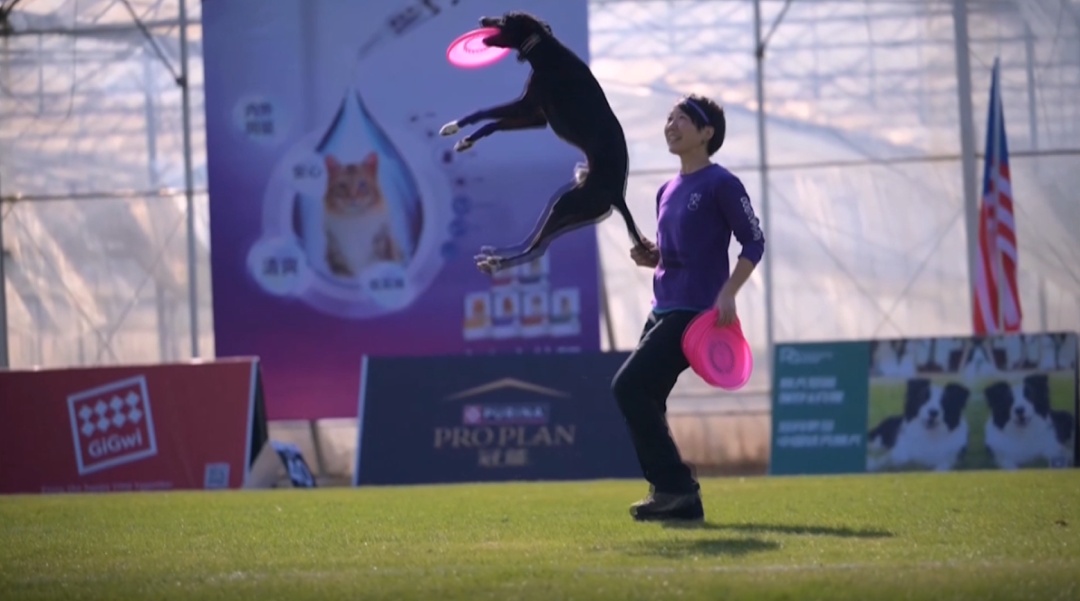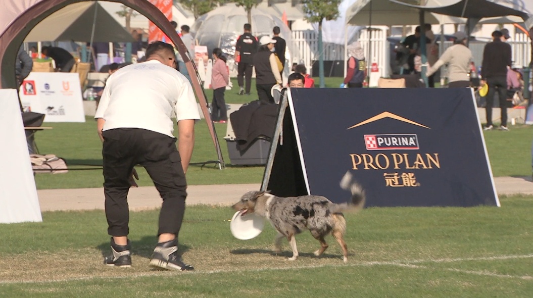 飞盘犬,一项人与狗配合的休闲体育运动,由主人抛投飞盘、宠物狗叼住的游戏。此次飞盘犬赛事为期两天,分为自由式和距离两个项目,吸引了来自中国、日本、韩国、中国香港、中国台湾等国家和地区的选手参赛。选手们在规定的时间内多次抛投飞盘,和爱犬一起通过精准的抛接、灵活的跑动和默契的配合,在赛场展开了激烈角逐。
