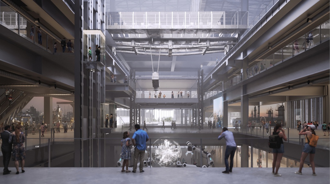 工博馆项目以工业画卷式连续波浪形屋面演绎工业浪潮,“工业之门”打造首发首秀、时尚消费体验空间,滨江大台阶作为建筑与滨江水岸共生的重要过渡,翻译馆和船舶馆延续起江南旧址记忆与世博地带肌理。按照“城市空间+数字空间+文化空间+生活空间”多元融合、“工商文体旅教科传”功能复合,跨界塑造“微车间”“微产线”,并聚焦“+制造”“+体验”“+品牌”“+艺术”“+设计”等维度,构建“工博馆+”生态圈,多方赋能、共同打造工业旅游新地标、工业记忆承载地、工业文化会客厅。