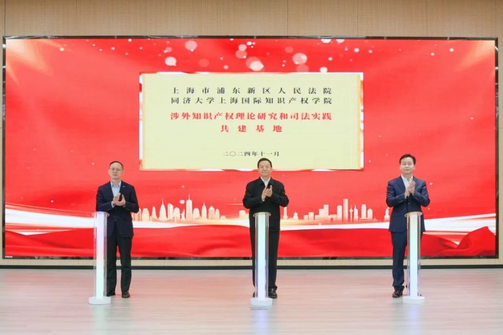 活动开幕式上,贾宇、吴金城、冯身洪共同揭牌成立同济大学上海国际知识产权学院与浦东新区人民法院“涉外知识产权理论研究和司法实践共建基地”,构建涉外法治人才培养共同体。