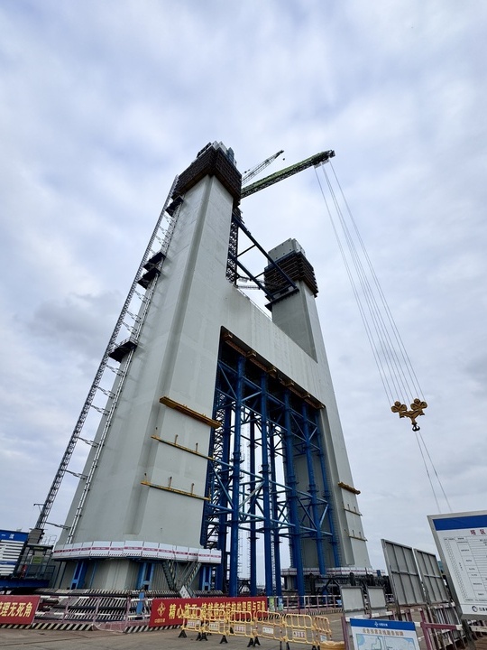 中交二航局张靖皋长江大桥施工现场,全球首台万吨米级塔吊如钢铁巨人伸展手臂,将重达260吨钢塔T14节段缓缓从地面吊起,“搭积木”般稳稳放落在塔柱上,索塔高度提升至143米。