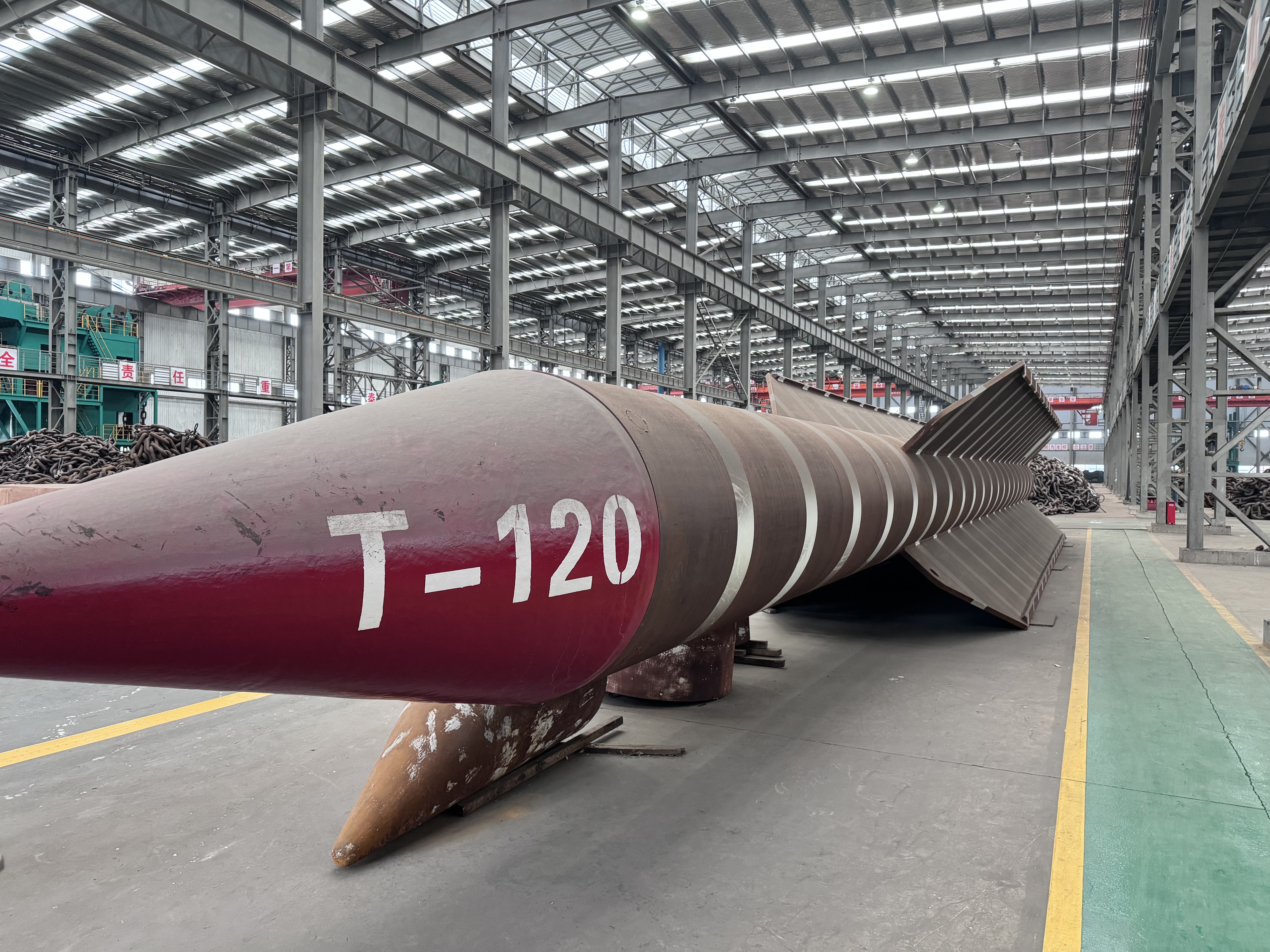目光转回亚星锚链厂内,一个形似导弹的巨大设备吸引了记者注意。“这款‘T-120’是我们在行业内首创的深海锚桩。以前在10米深的海里打桩至少需要1至2天。现在利用锚桩自重带动锚链,只需10分钟就能完成,无需打桩,极大提升了作业效率和稳定性。”该公司副总经理张卫新说,截至目前,亚星锚链占有船用锚链和系泊链全球市场份额达到50%以上,万吨级以上轮船90%使用的是该公司产品。