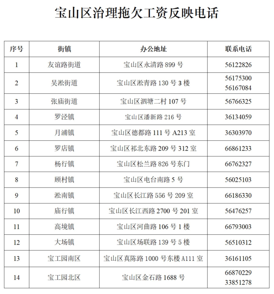 为深入开展治理欠薪工作,严格落实《保障农民工工资支付条例》,进一步畅通劳动者维权渠道,就近、快捷、高效响应劳动者欠薪维权诉求,现向社会公布宝山区各街镇(园区)劳动关系矛盾预防协调中心地址及电话。劳动者如被拖欠工资,工作日(9:00—16:30)可以直接通过电话或至相关街镇反映。