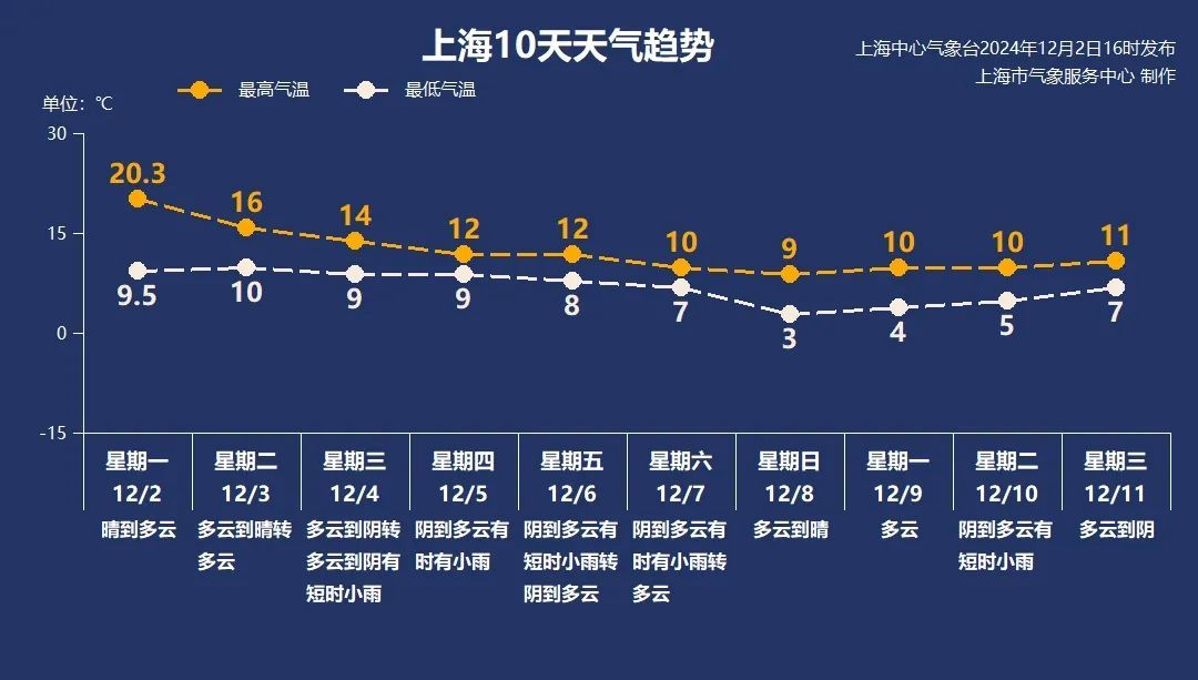 本周中后期申城晴好天气“售罄”。周三白天云系增多转多云到阴,受高空槽东移影响,周三夜里起转多云到阴有短时小雨,阴阴雨雨的天气要一直持续到周六白天。气温则一降再降,周三最高气温还有14℃,双休日在冷空气影响下,气温全线跌至10℃以内,冬天真的要来了~