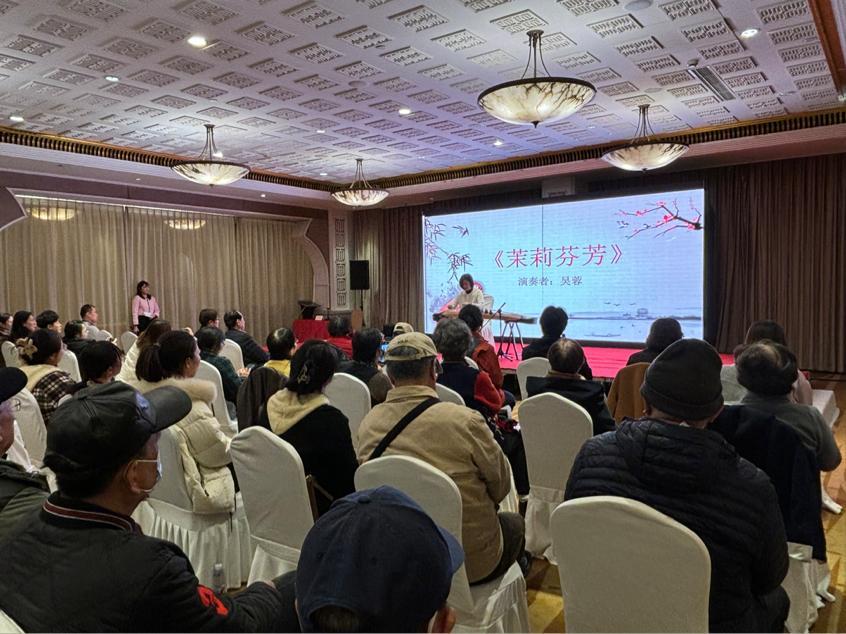 现场,青年古筝演奏家、何占豪的学生吴蓉演奏的《茉莉芬芳》拉开活动帷幕。这首作品由何占豪创作于1991年,乐曲根据传统曲目江苏民歌《茉莉花》为素材改编创作而成,作品展现人们对美好生活的向往与追求,具有浓郁的江南文化色彩。