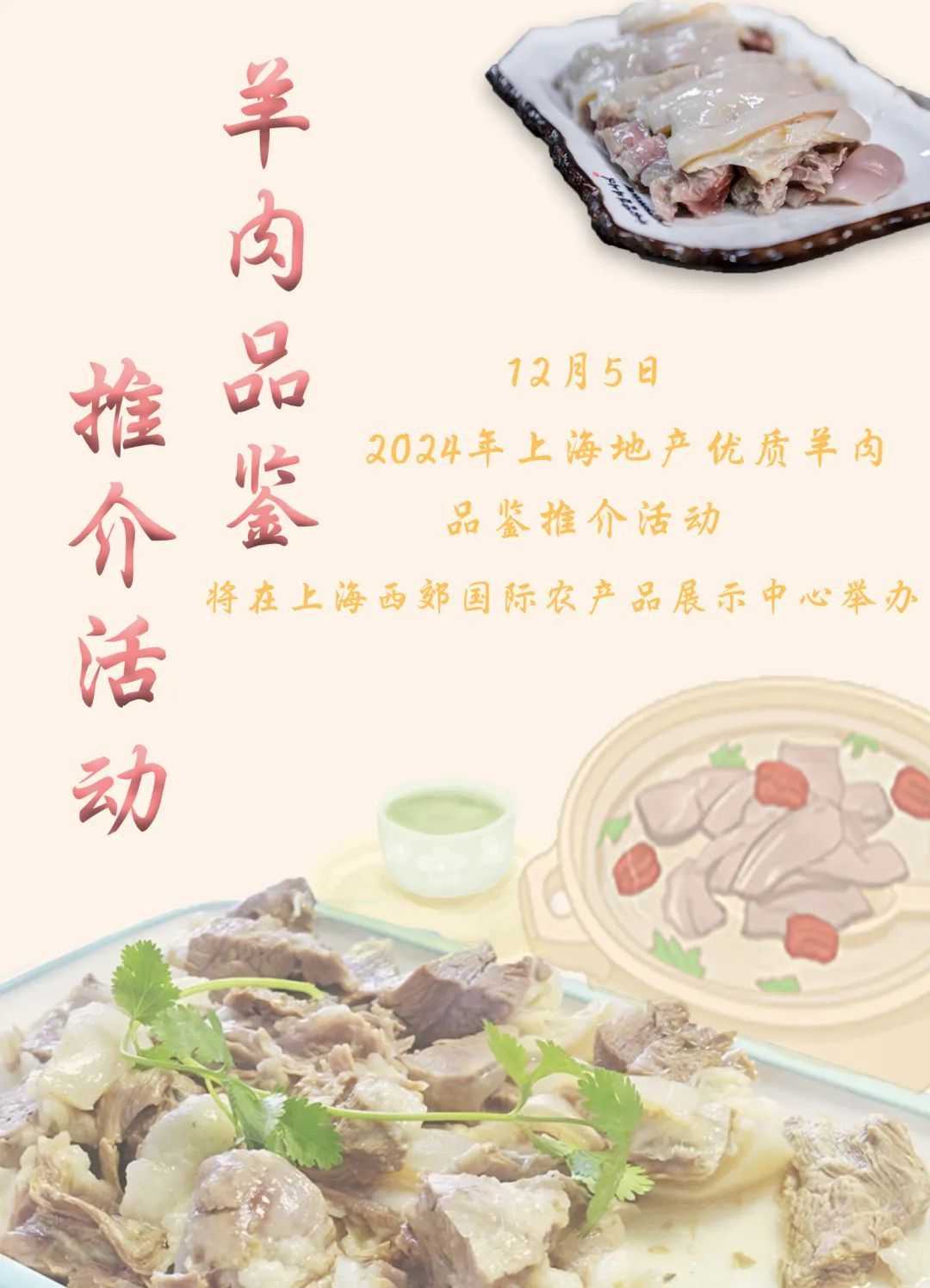 12月5日,2024年上海地产优质羊肉品鉴推介活动将在上海西郊国际农产品展示中心举办。本次活动将展示本市肉羊产业发展情况,并进行特色羊肉菜品品鉴讲解,一起期待吧!届时,“上海三农”将报道现场活动情况,敬请关注。