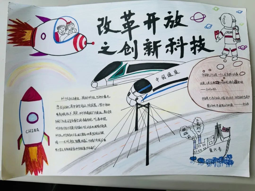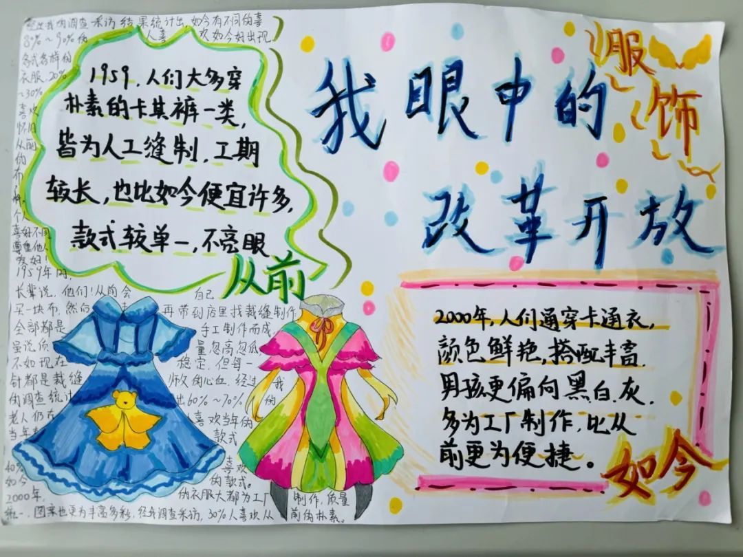 采访中,罗山中学校长袁钫芳给小编展示了两张学生制作的海报,一张记录了改革开放以来服饰的变化,另一张则图文并茂地展示了改革开放后中国交通的发展。