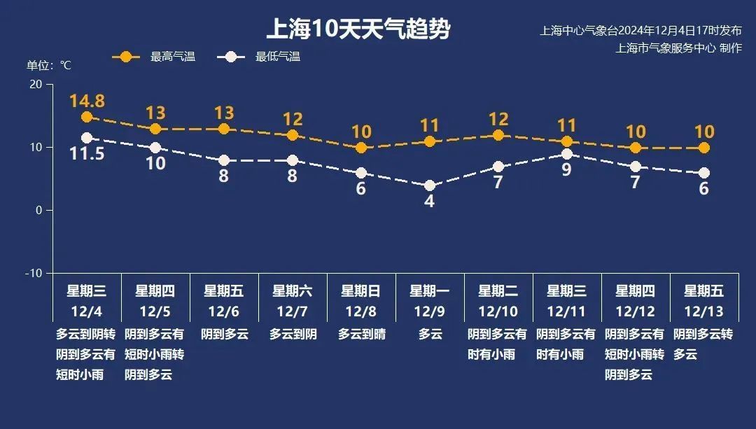 双休日天气总体不错,特别是周日阳光明媚,适宜洗晒。冷空气扩散影响下,风力较大,北到西北风4~5级,气温小幅下降,周日气温在6~10℃之间,体感上会冷不少。此次冷空气影响下的最低气温出现在下周一,市区最低气温只有4℃,郊区可能跌至冰点以下。下周中后期阴雨天气增多。持续不断的冷空气渗透影响下,下周气温回升乏力,基本保持低位运行,最高气温不超过12℃。冷空气推动入冬进程,气温总体下降,大家请根据天气变化适时调整着装,谨防感冒。