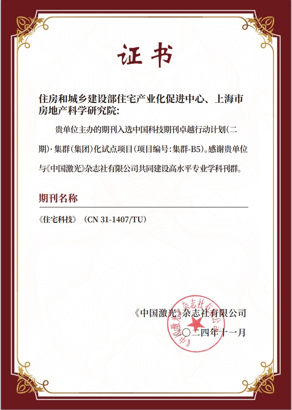 近期,《住宅科技》杂志成功入选由《中国激光》杂志社牵头的中国科技期刊卓越行动计划(二期)·集群(集团)化试点项目(项目编号:集群-B5)。该项目由中国科协、教育部、科技部、财政部、国家新闻出版署、中国科学院、中国工程院联合设立并组织评选,旨在加快培育我国世界一流的科技期刊。下一步《住宅科技》将与《中国激光》及其它集群期刊一同,深化交流与合作,持续增强科技期刊的学术引领力,努力提升国际影响力,共同促进期刊高质量发展。