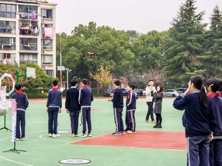 活动在无人机编队舞蹈飞行表演中拉开帷幕。五架无人机在《我和我的祖国》的悠扬旋律中灵活穿梭,组成各种队形,展现出科技与艺术的结合,精彩的表演迅速点燃了全场气氛。在后续的教学环节中,学生们通过了解无人机编程和飞行路线规划,深入探索无人机技术背后的奥秘。