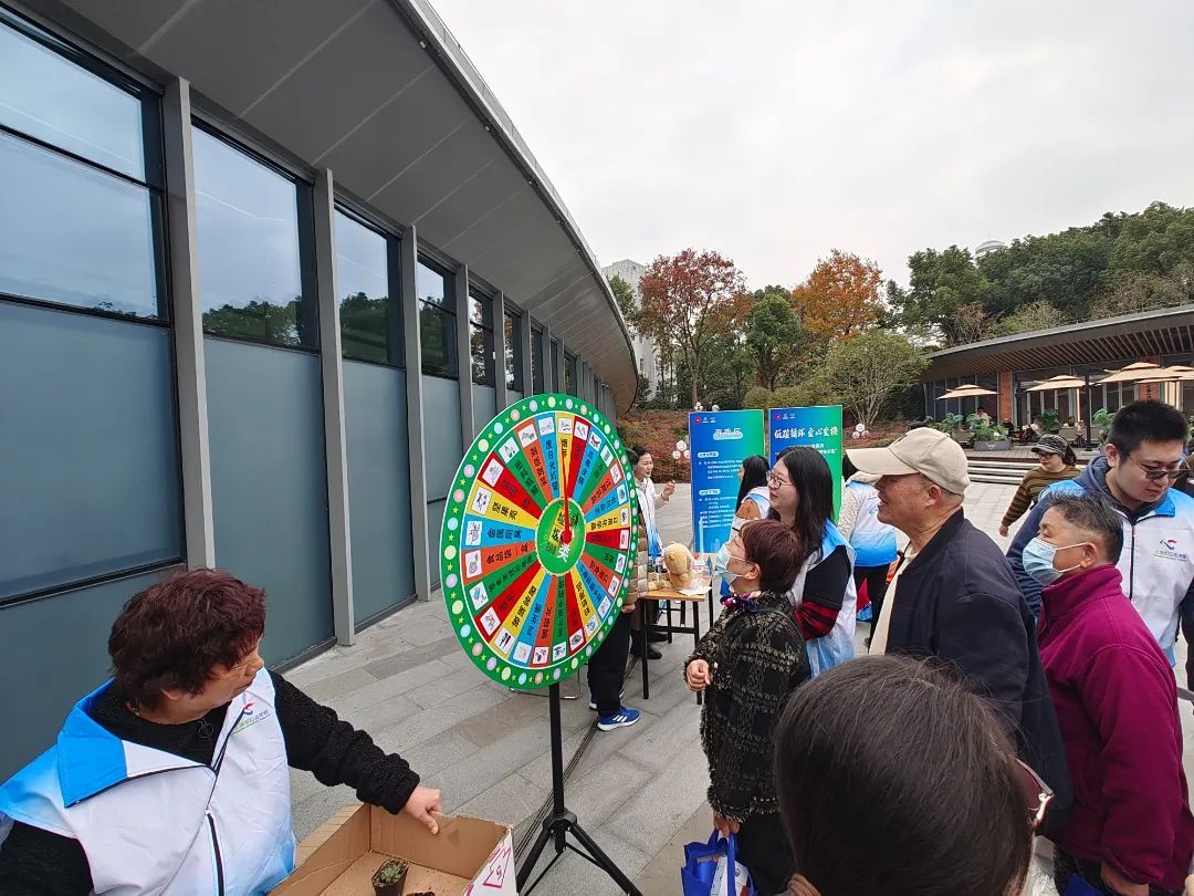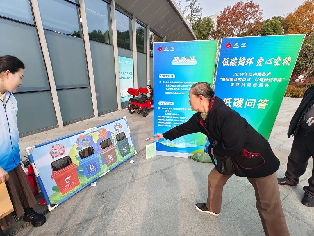 “废日光灯属于哪种垃圾?”“有害垃圾。”“恭喜您答对了,可以领取一份小礼品。”在“低碳问答”分类大转盘区内,参与市民旋转转盘后,正确回答指针所指的垃圾的分类方式就能获得奖品。沙包飞飞乐区内,社区居民们也跃跃欲试,只见一位阿姨将印有 “废旧电池” 名称的沙包稳稳地投入了写着 “有害垃圾” 的垃圾桶中,周围的志愿者们不禁发出了阵阵喝彩声。