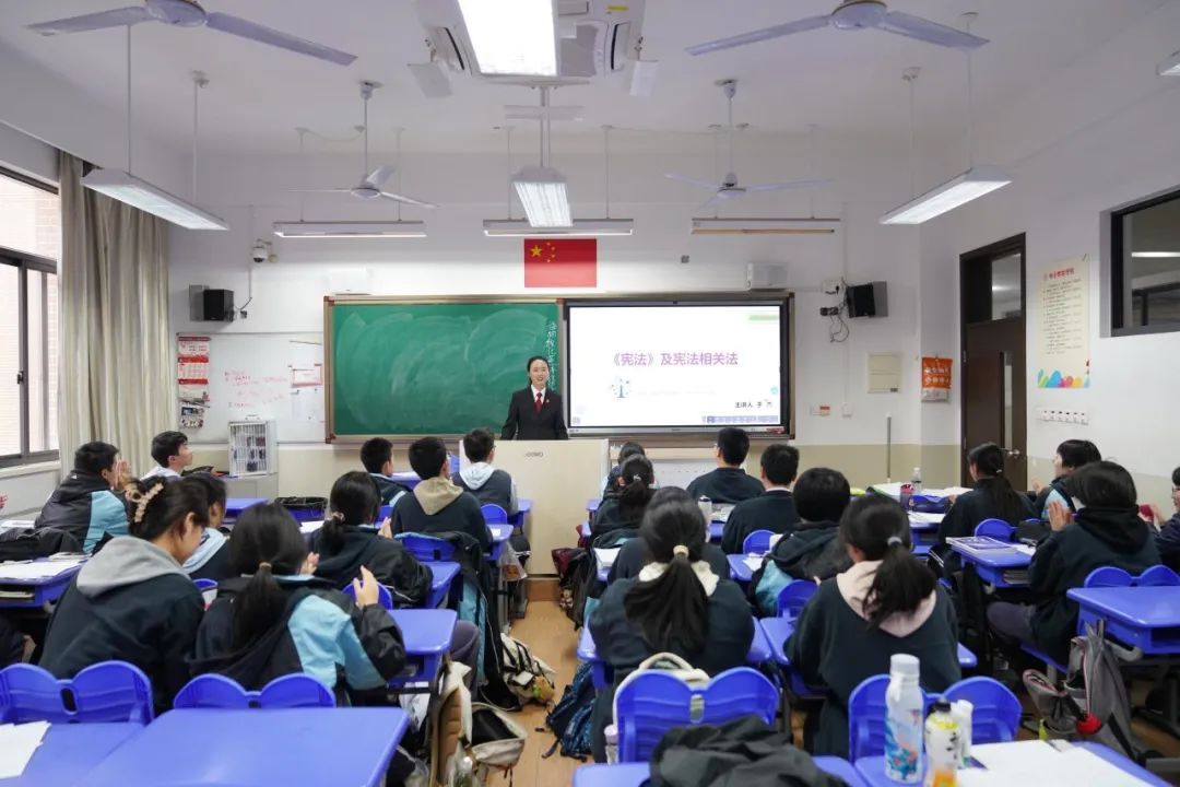 “很高兴今天到学校来给大家上课!首先,让我们来了解一下宪法的含义……”12月3日下午,徐汇区人民法院“甘棠树下”社区法官工作室法官助理于杰赴上海市南洋中学,为高一、高二学生宣讲宪法及宪法相关法。