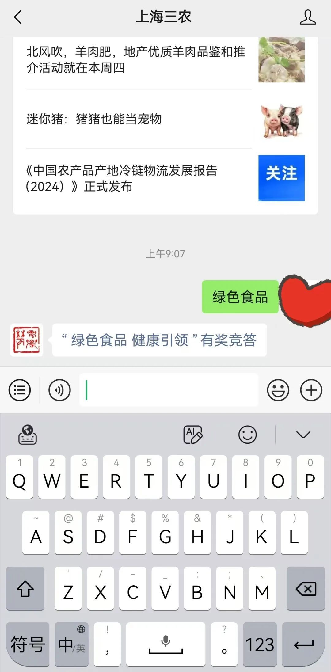 关注“上海三农”公众号,回复“绿色食品”获取答题链接。或扫描下方二维码进入答题通道。