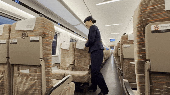 由于动车组列车可以双向行驶,抵达一趟交路终点站返程时,需要调转座椅方向,“犄角”其实是乘务员用来旋转座椅的“小把手”。